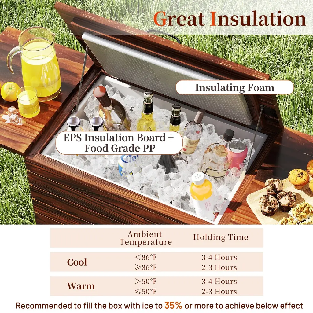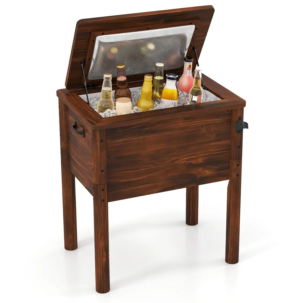 SpecificationsDescription:This 54-quart patio cooler combines spacious capacity and efficient temperature retention, designed to keep drinks chilled for up to 4 hours or food warm during outdoor gatherings. Crafted from solid pine and fir wood with a rustic brown finish, its surface is treated for durability and resistance against cracking from extended outdoor exposure. The cooler comfortably holds up to 72 standard cans and features side folding shelves plus a bottom storage rack, providing ample space for glasses and accessories. A built-in bottle opener adds convenience, while the drain hole with a plug allows for quick drainage and easy cleaning. Mounted on four smooth-rolling wheels—two equipped with brakes—this cooler is easy to maneuver across decks, patios, or backyards, making it an ideal companion for poolside parties and outdoor entertaining.