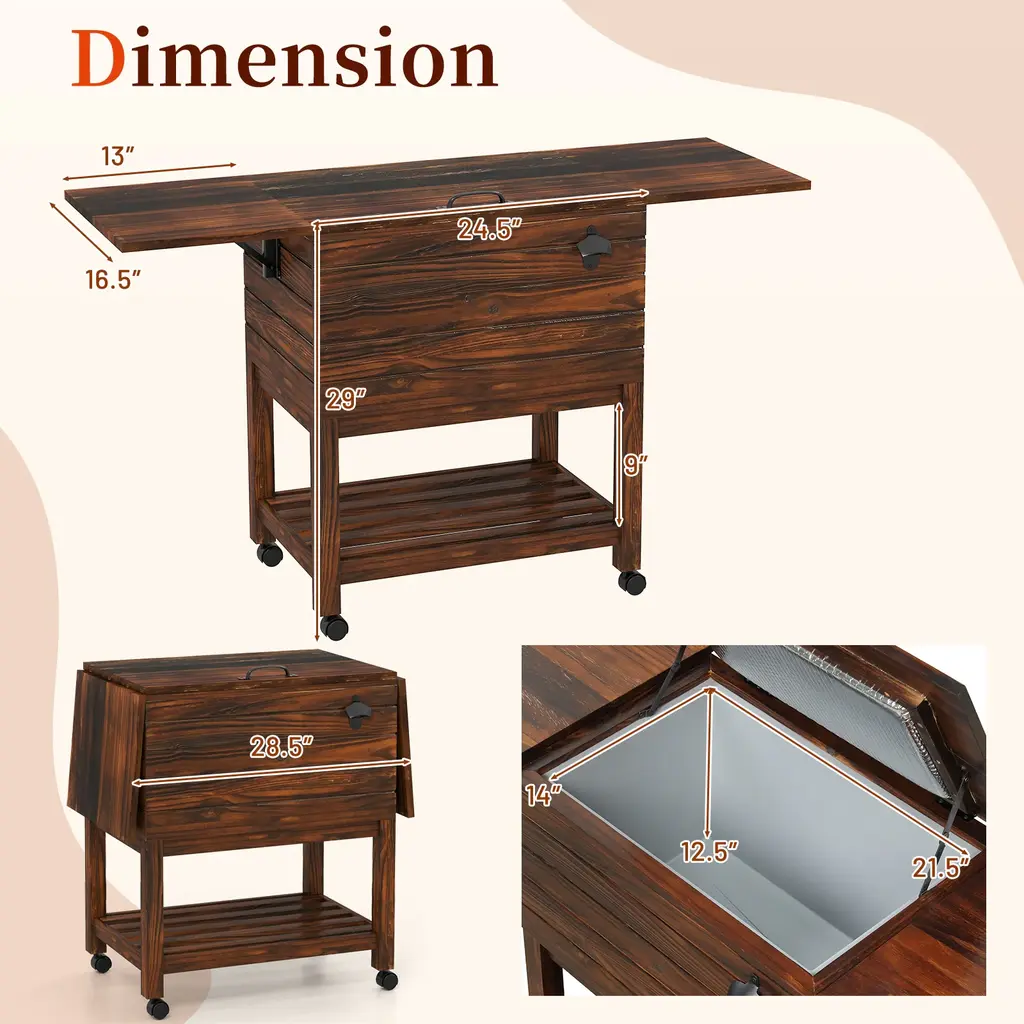 Rustic Brown Pine Wood Patio Cooler 54qt With Wheels And Folding Shelves - 50" L X 16.5" W X 29" H - Rustic Brown