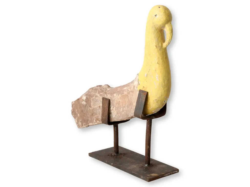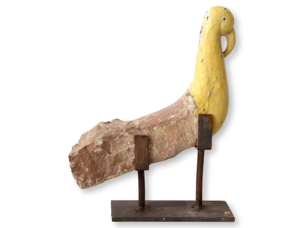 Rustic carved stone bird on a custom wrought iron stand. Purchased in Paris. No maker's mark.