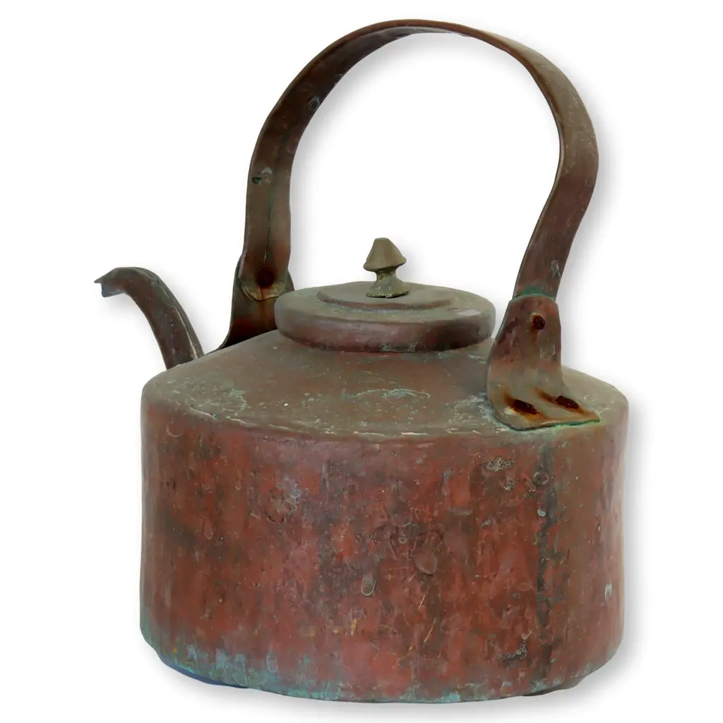 Embrace rustic charm with this antique copper kettle. Its verdigris, tarnish, and patina only enhance its allure. This hand-hammered piece isn't just decorative; it's perfect for use as a watering can, both indoors and in your garden. Add character and functionality to your space with this timeless treasure.