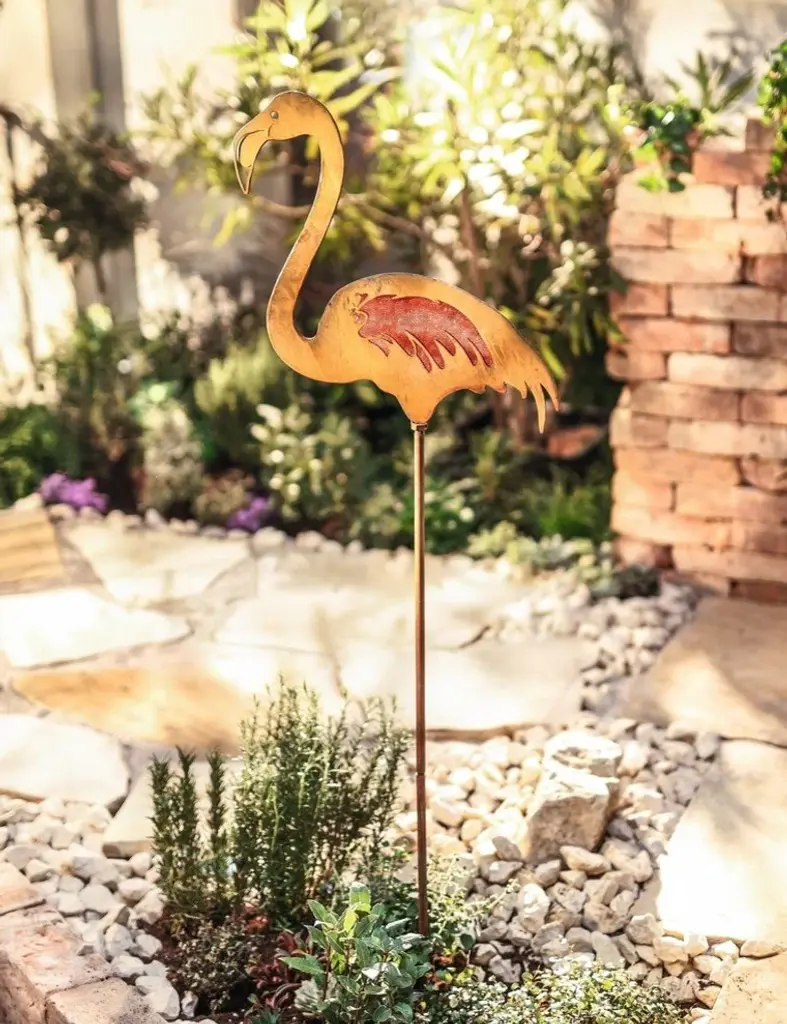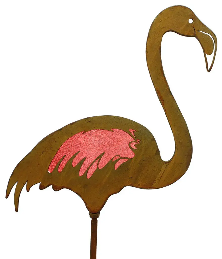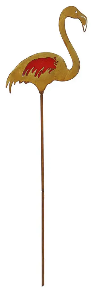 Original garden decor in a simple design, this delightful metal Flamingo silhouette has been mounted on a garden pick for greater versatility in displaying it. Place it in a flower pot, planter, or backyard etc, it will add rustic charm to your garden wherever you prefer. In a trendy rust tone with pleasant traces of use, this Flamingo garden pick comes with a warm red glass feather accent at the center. Product SKU: GD229993;Dimensions: 15.7" W x 16.9" " H for design, overall height with ground stake 56";Weight: Approximately 2 lbs;Use: Outdoor use in your garden or patio. Provides visual and auditory beauty for your yard and patio;Material: Metal;Includes: One rustic Flamingo metal garden pick.