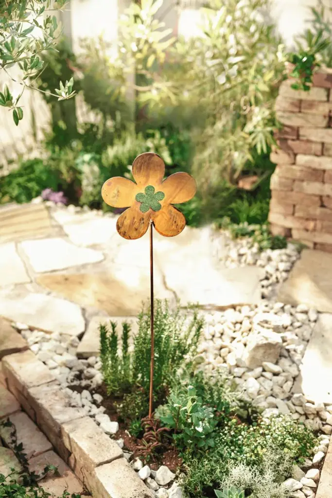 Rustic Flower Metal Garden Pick With Green Glass Center
