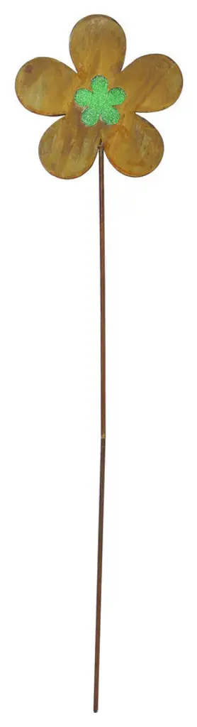 Metal flower brings the magic to your landscape. Mark a garden path or cast an eye catching view with this distinctive wire work. At 10.6" dia and 47.25" high overall, this will be visible above most garden plants. Original garden decor in a simple design, this delightful metal flower silhouette has been mounted on a garden pick for greater versatility in displaying it. Place it in a flower pot, planter, or backyard etc, it will add rustic charm to your garden wherever you prefer. In a trendy rust tone with pleasant traces of use, this garden pick comes with a warm green glass flower accent at the center. Product SKU: GD229992;Dimensions: 10.6" Dia x 47.25" H;Weight: Approximately 1 lbs;Use: Outdoor use in your garden or patio. Provides visual and auditory beauty for your yard and patio;Material: Metal;Includes: One rustic flower metal garden pick.