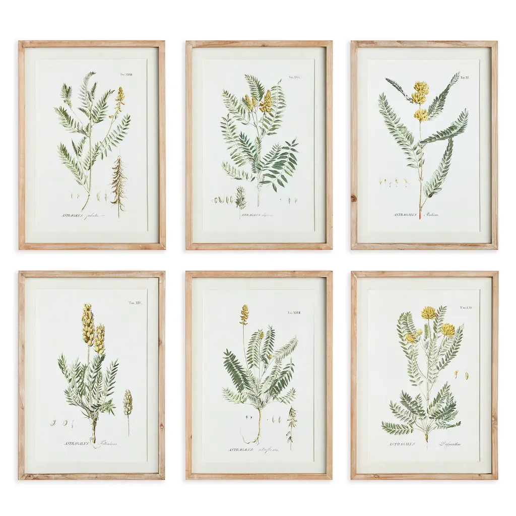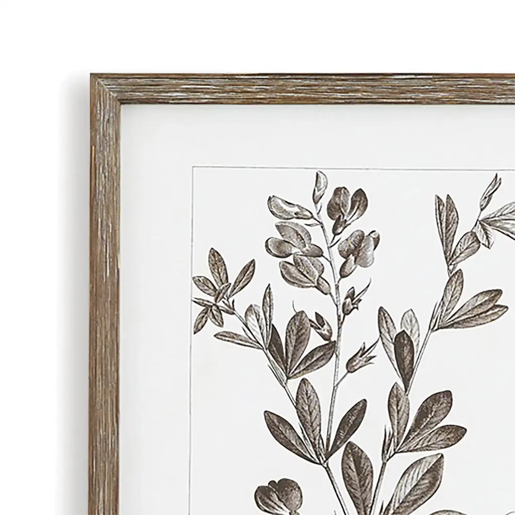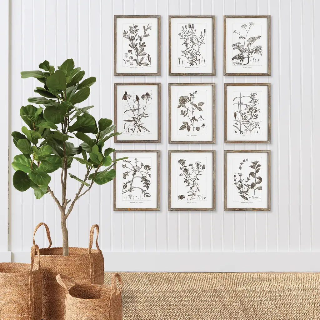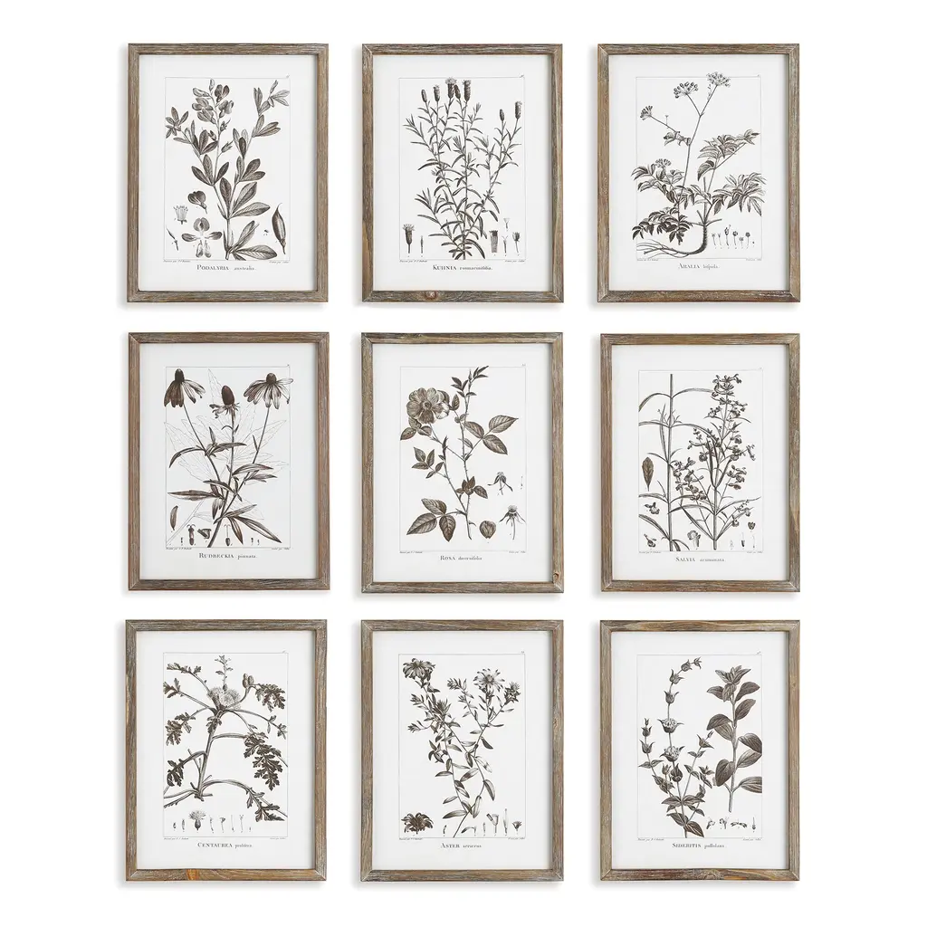 These traditional rustic foliage prints are a warm, dark sepia tone contrasted with a light wood frame. Finished off with real mats, this set of nine is neutral in tone and a stunning choice for home office or study.