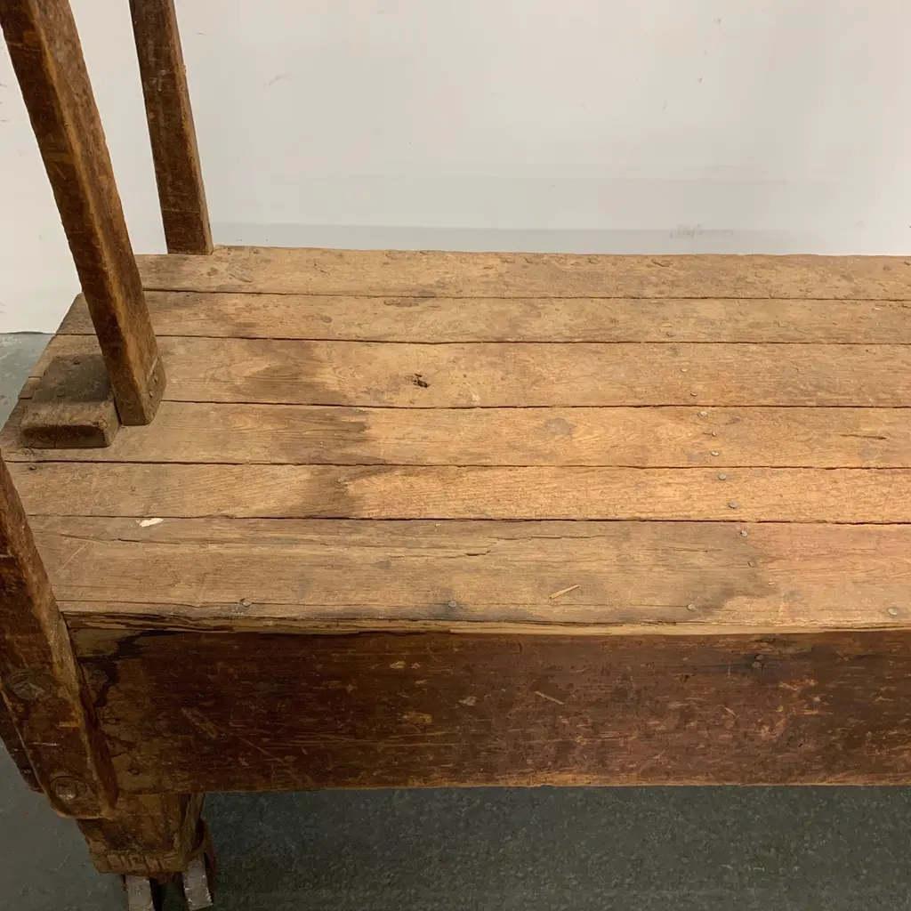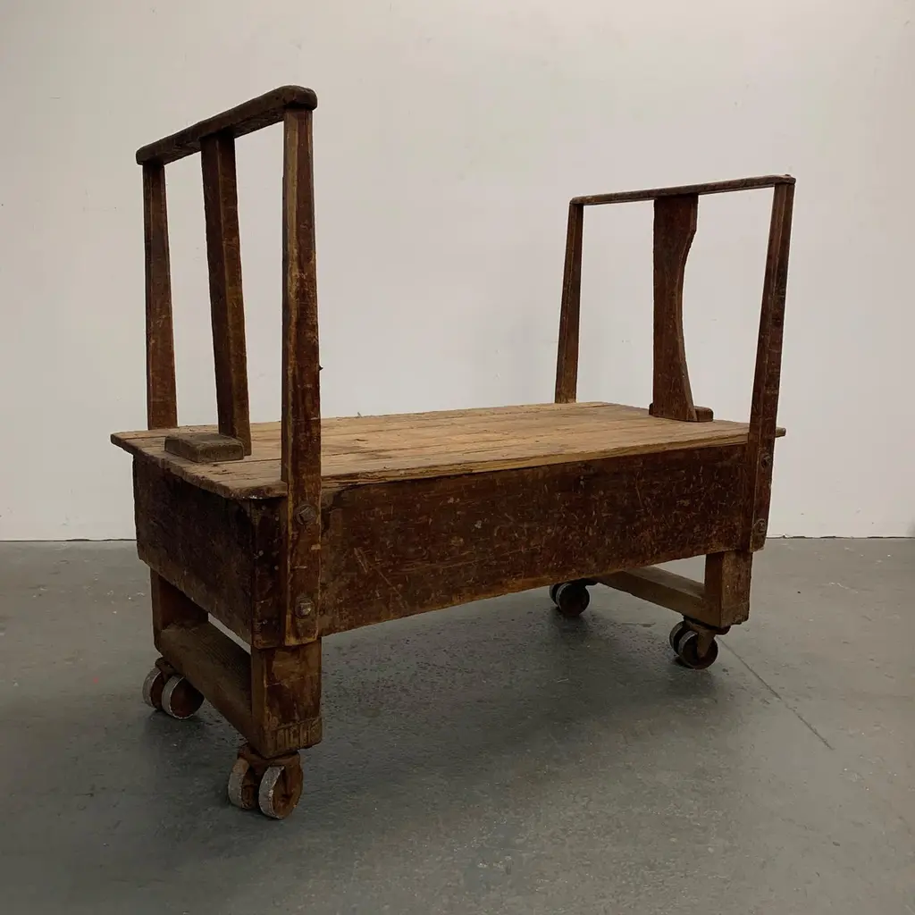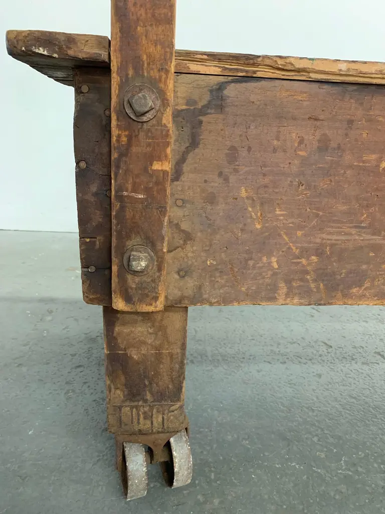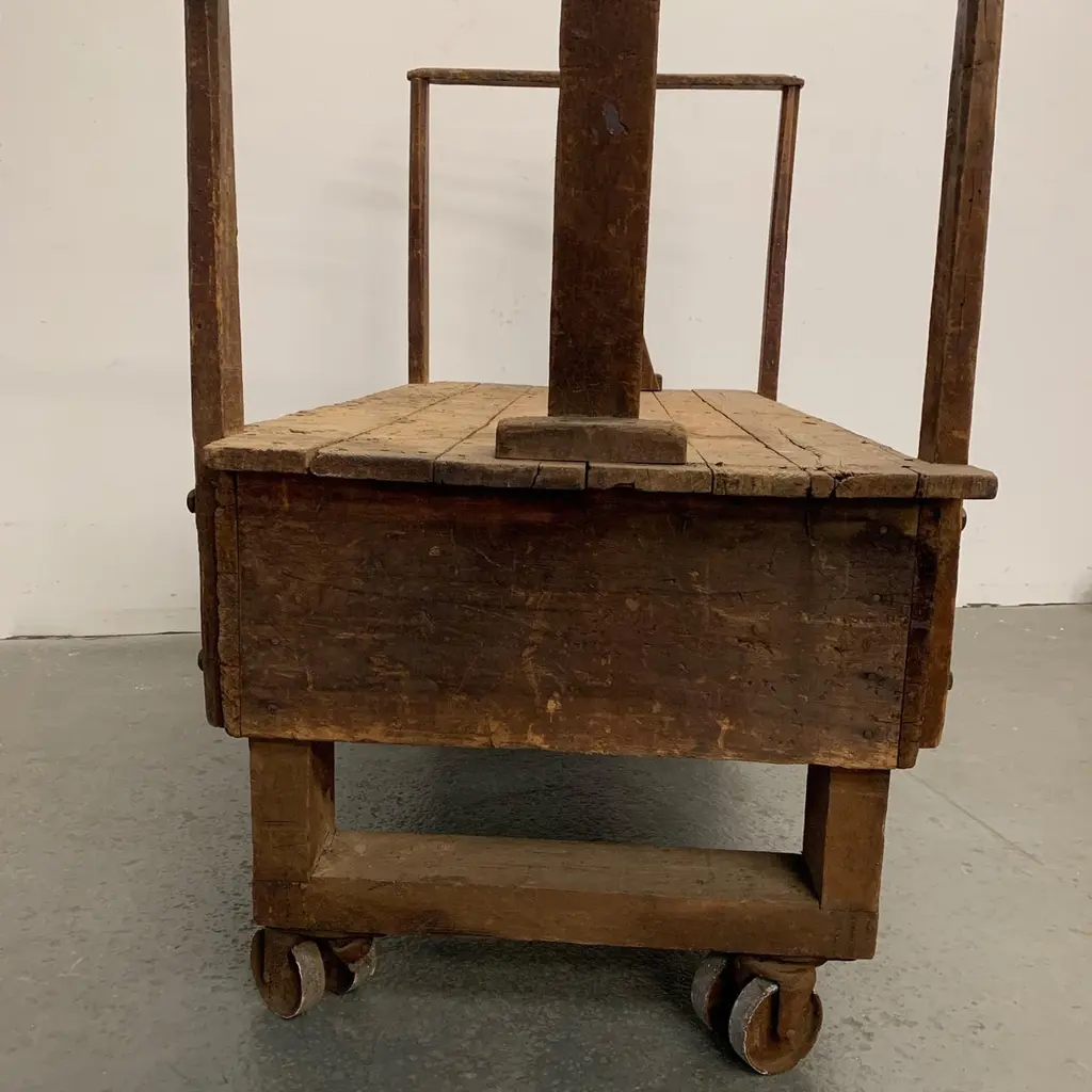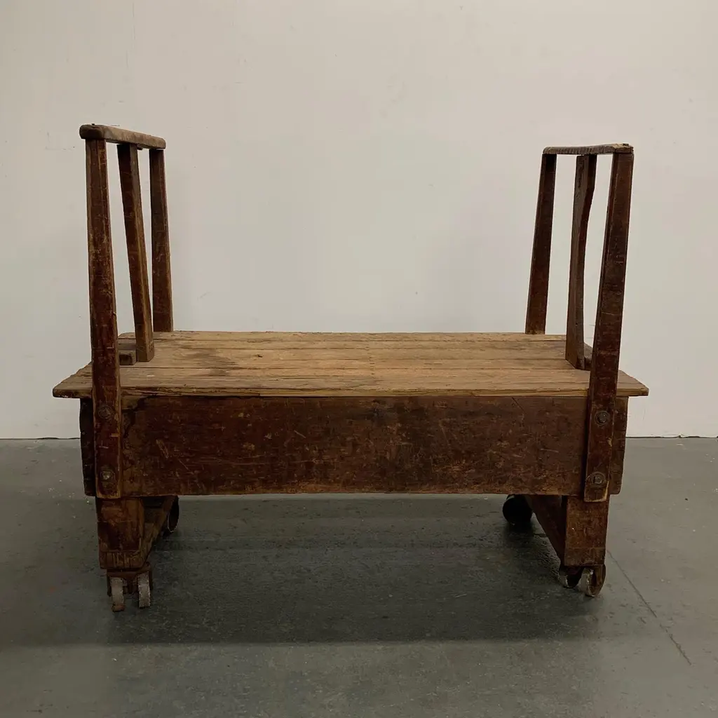 Rustic, industrial, rolling lumber cart featuring a slat pine surface in it's original, work-worn patina with tall side risers, can be repurposed for a multitude of uses.