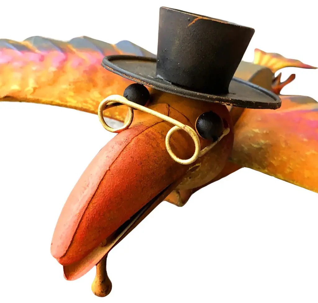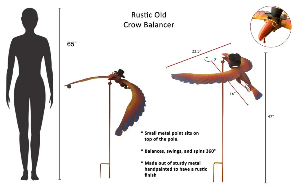 This metal rustic spinning old crow balancing garden stake is a charming and functional piece of outdoor decor designed to an age weather appearance from the rustic finish for vintage charm. The bird spins in a 360 degree motion while also bobbing up and down adding visual interest and whimsy to any garden or yard.Crafted from durable metal to withstand mild to moderate weather conditions this garden stake will be a wonderful statement piece outdoors.