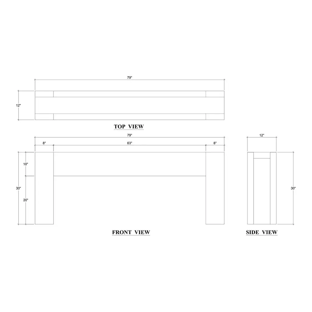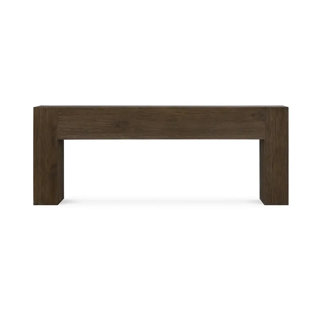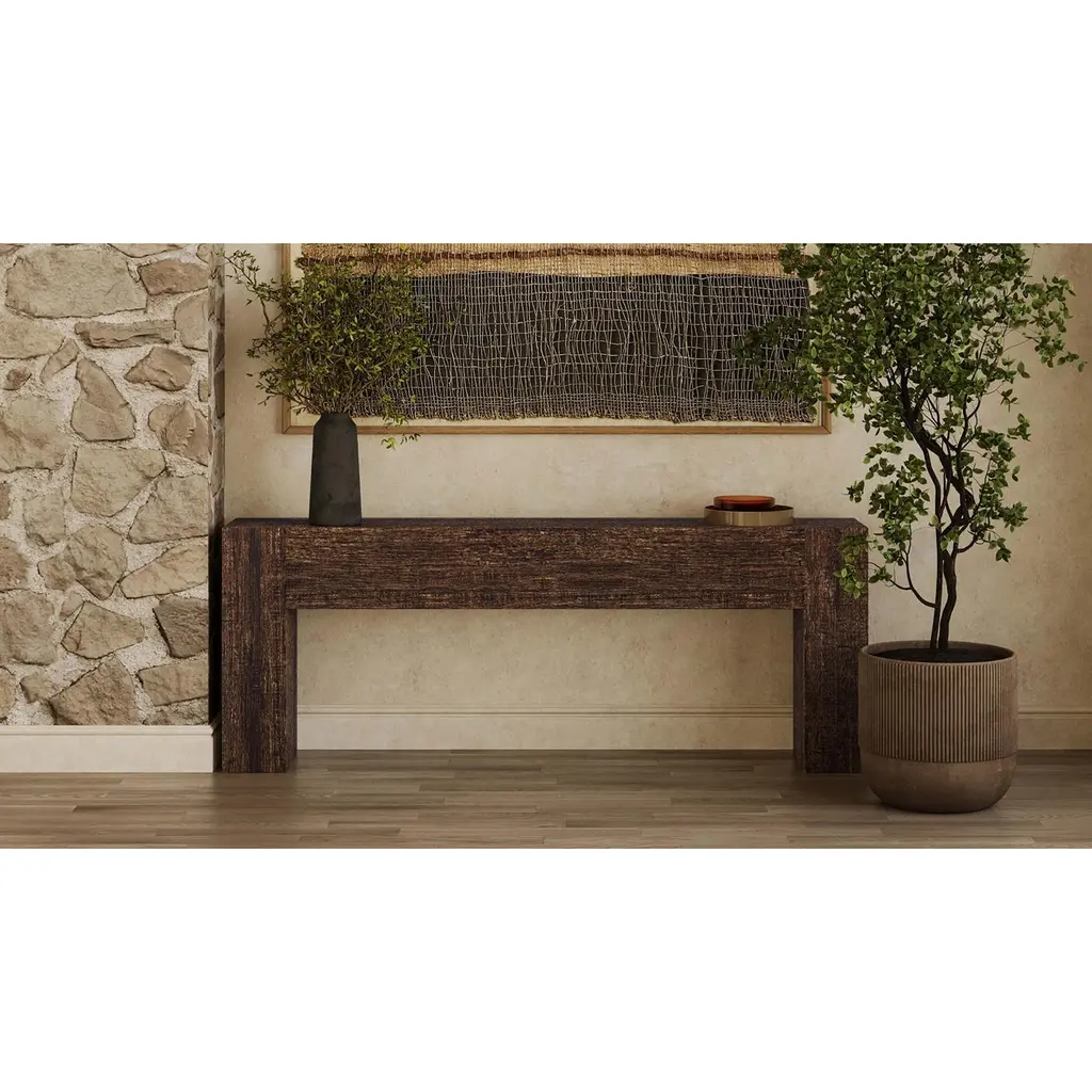 Crafted from teak in a Tuscan Brown finish, its block-style form is softened by a weathered, distressed surface that lends depth and natural character. The substantial proportions and clean, uninterrupted planes make it a powerful yet understated presence in both rustic and contemporary interiors. With its pared-down geometry and natural warmth, this console table functions as a sculptural anchor in entryways, behind sofas, or along feature walls. The long top is ideal for displaying art objects, ceramics, or layered decor, while the wide open base adds visual lightness. A true expression of elemental design, this piece embraces authenticity, balance, and quiet luxury. Dimensions: 79" W x 12" D x 30" H