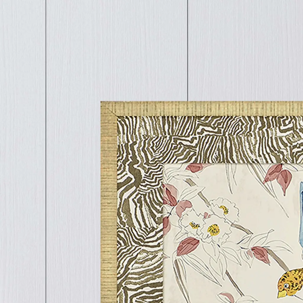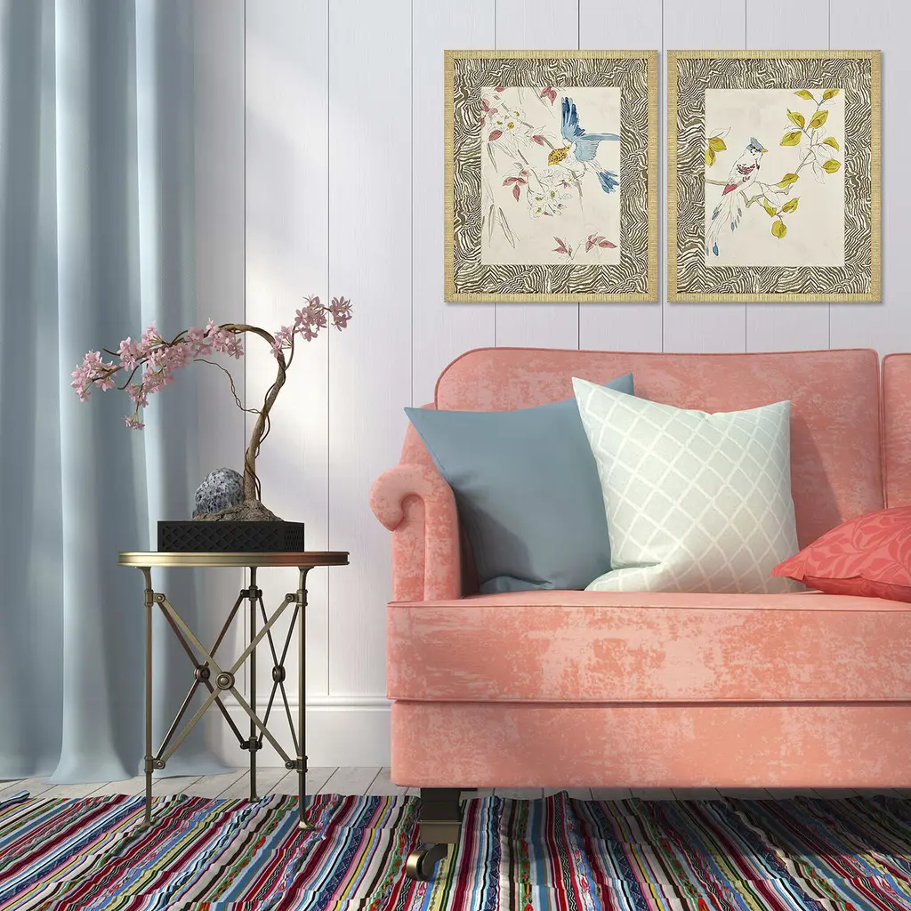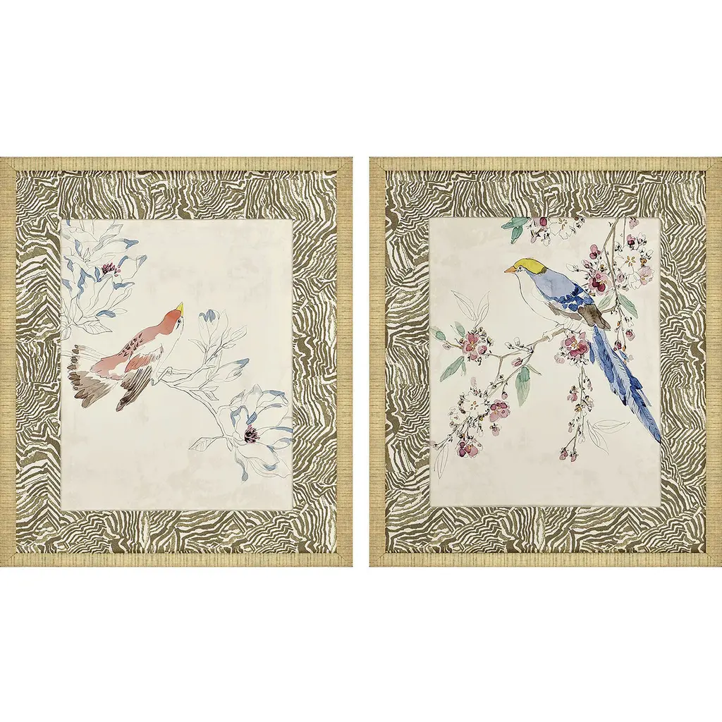 Delicate birds feature hand applied decorative paper matting. Framed in a ribbed moulding in distressed gold.