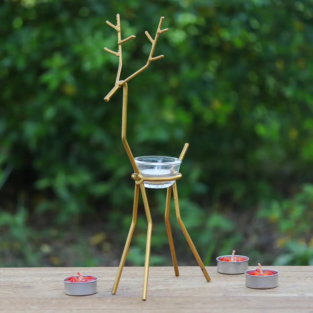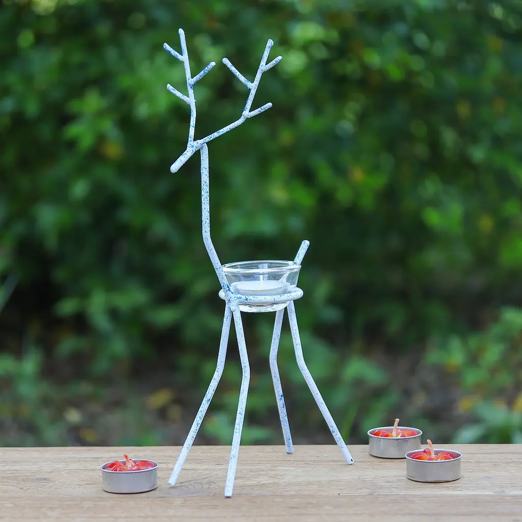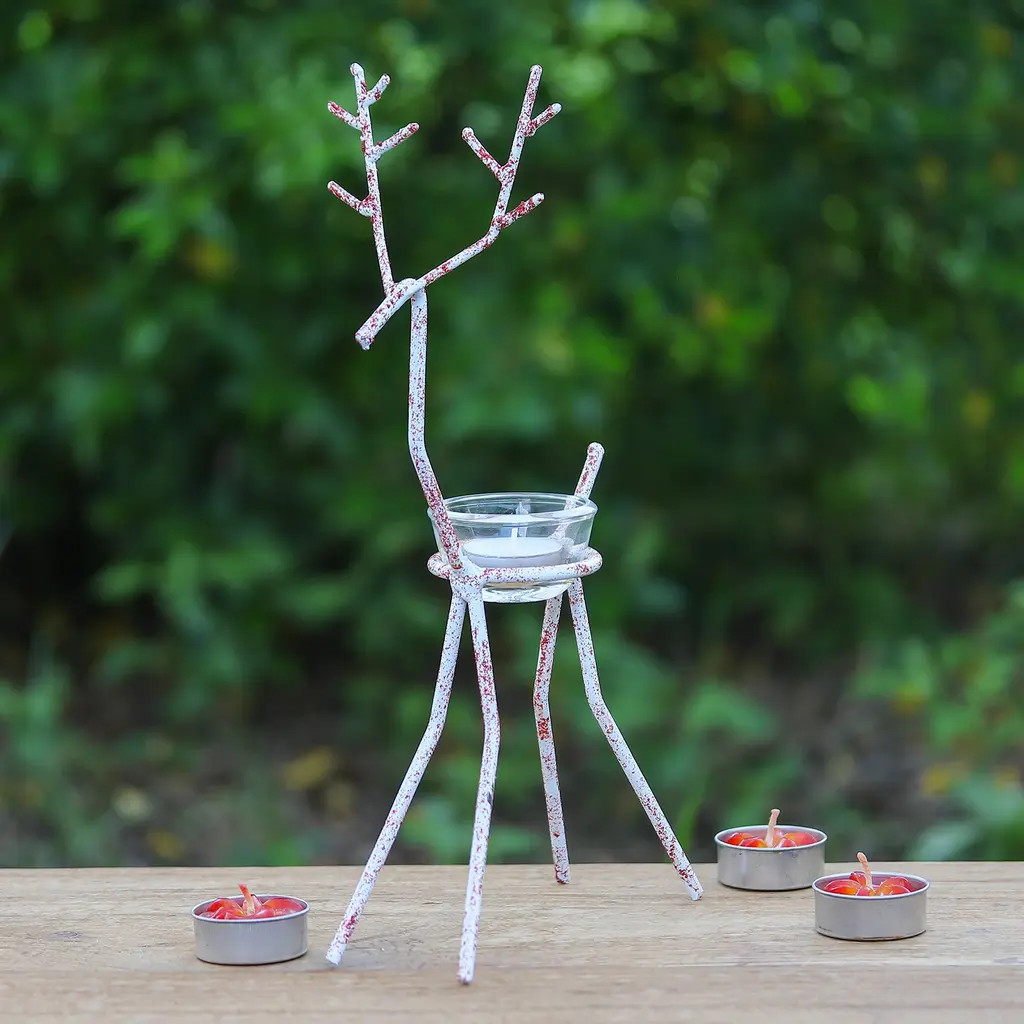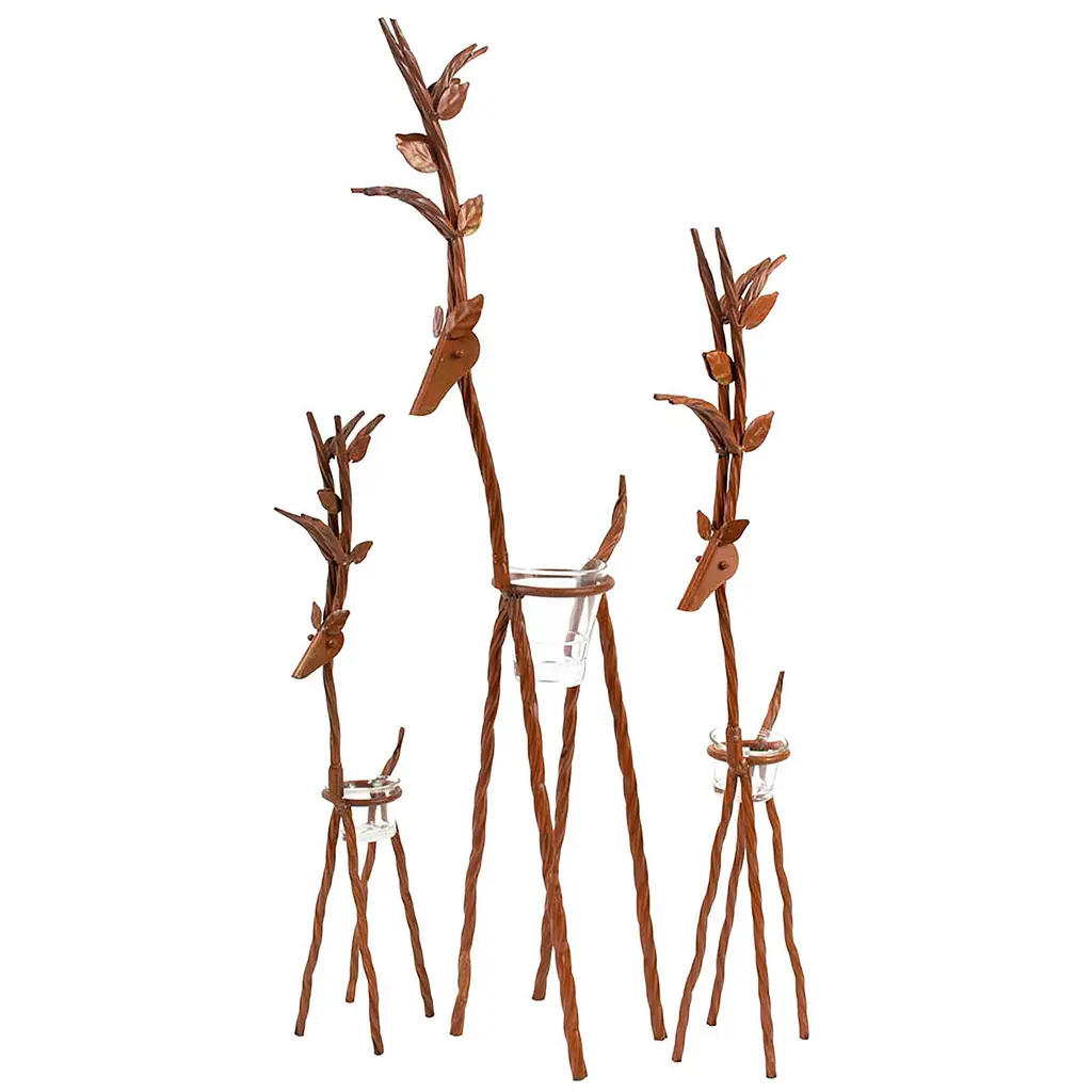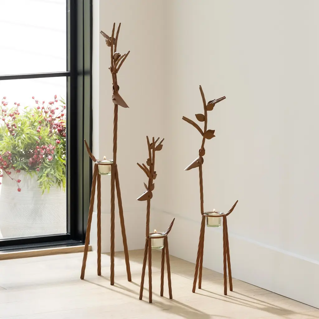 Light up your home this holiday season with this charming set of three iron reindeer! Each comes with a glass tealight holder. Use these capricious and delightful reindeer to create an adorable holiday display with the set of all 3 Reindeer Tea Light Holders. Each metal reindeer has a spot to hold a tea light or LED tea light candle. Keep your little herd together or split them up around the house.