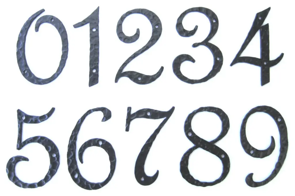 These wrought iron address numbers have an elegant style of font and authentic rustic hammered texture. These are wrought iron and not cast iron. Each wrought iron number has it's own unique character. Your choice of 4 inch or 6 inch tall and choice of finish. Black or bronze. Mounting screws are included with each number. Priced per number.