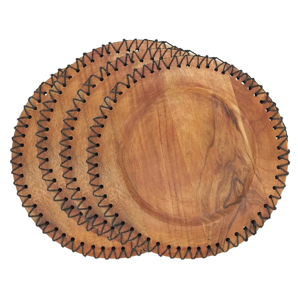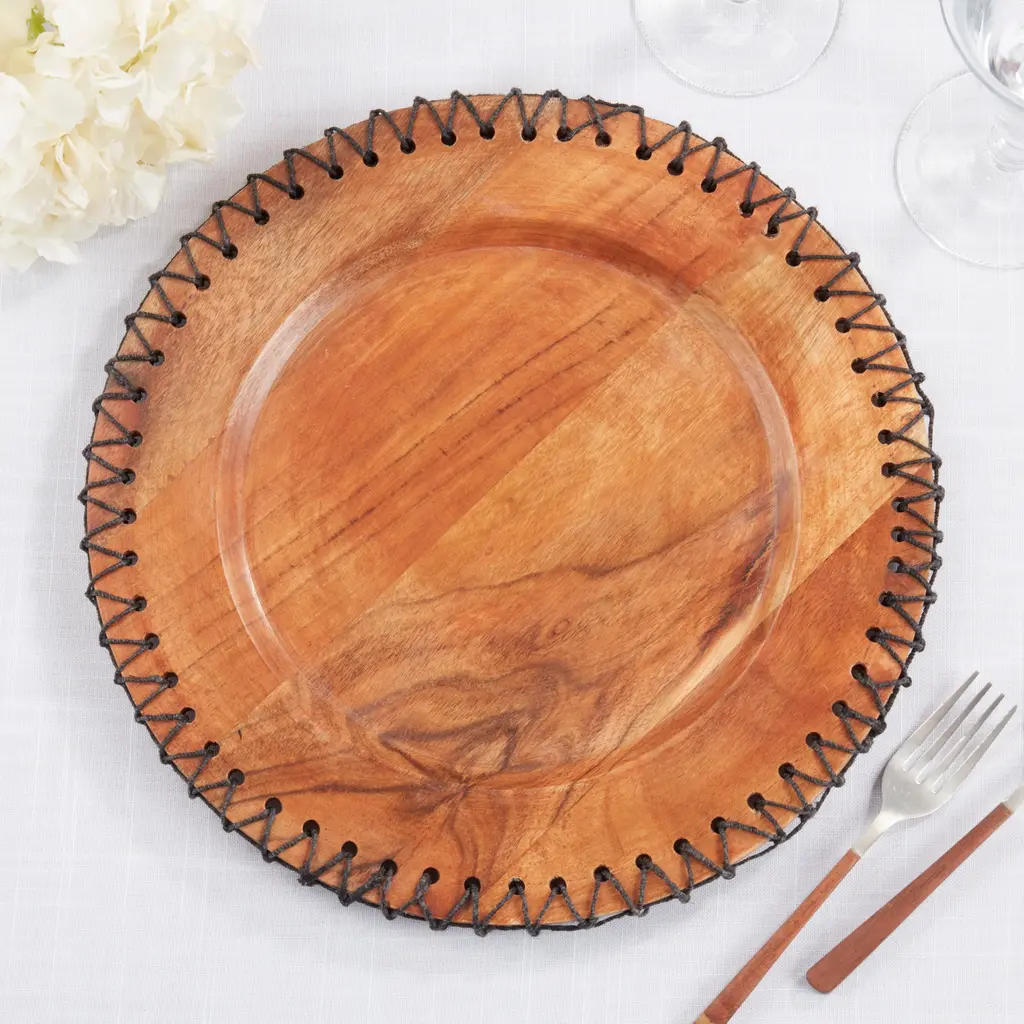Enhance your dining experience with this set of Rustic Stitched Edge Wood Charger. Crafted with care and attention to detail, these chargers add a touch of natural elegance to your table setting. Each charger features a rich, textured wood surface with a charming stitched edge that exudes rustic charm. Whether you're hosting a casual family dinner or an elegant soirée, these chargers provide a warm and inviting backdrop for your tableware.Features: