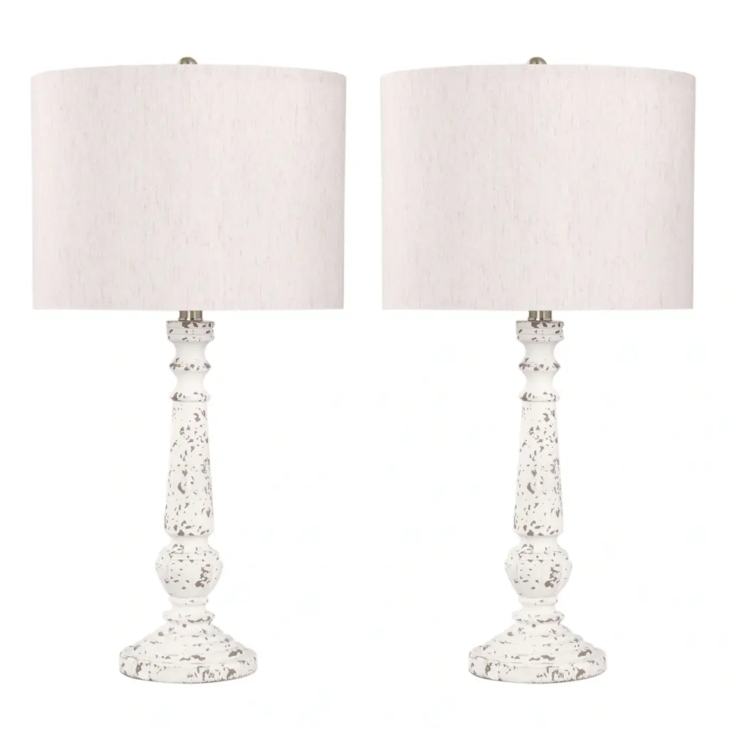 This set of two exquisite table lamps are crafted from white resin with irregular spots texture. Shade is made of plain white linen, giving the whole lamp a strong retro style. The light coming out of the one E26, 60W light bulb (sold seperately) will spreads through out the whole room. Full of Euro and farmer style, great for bedroom lighting, you may place it in your living room as well. By standing there, the lamp reveal a feeling of elegance, fit for any room decoration.Feature:Product informations: