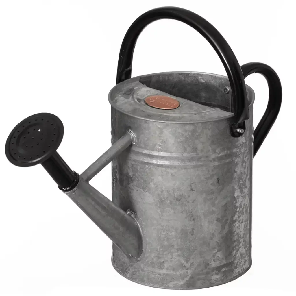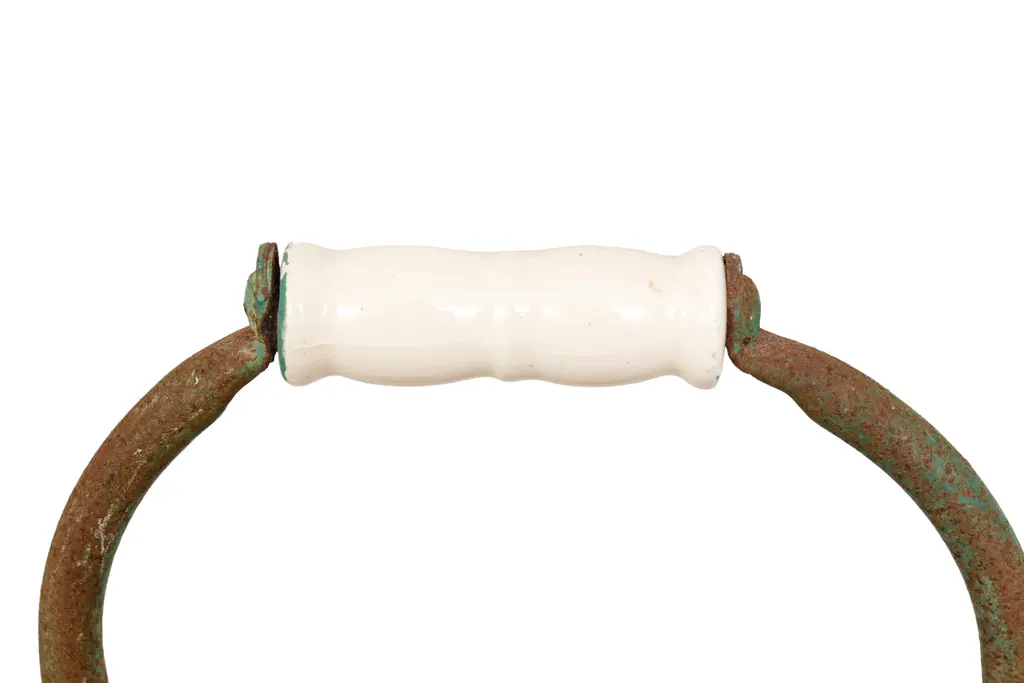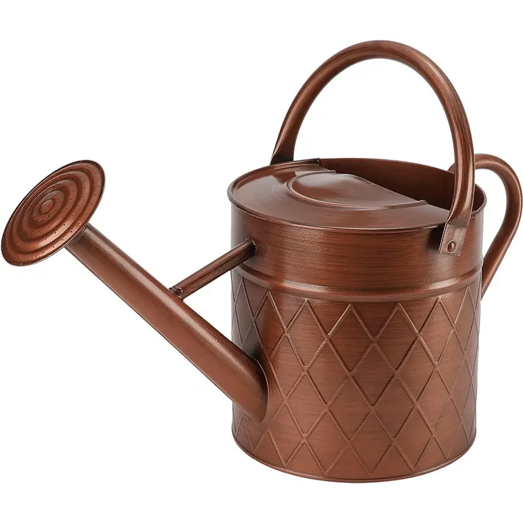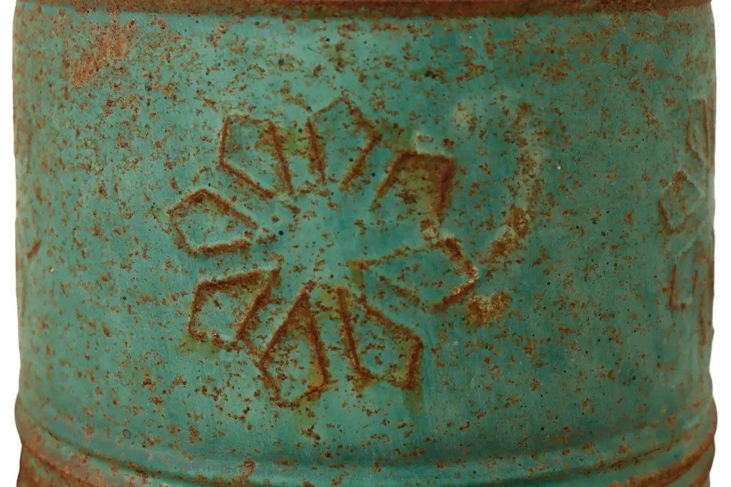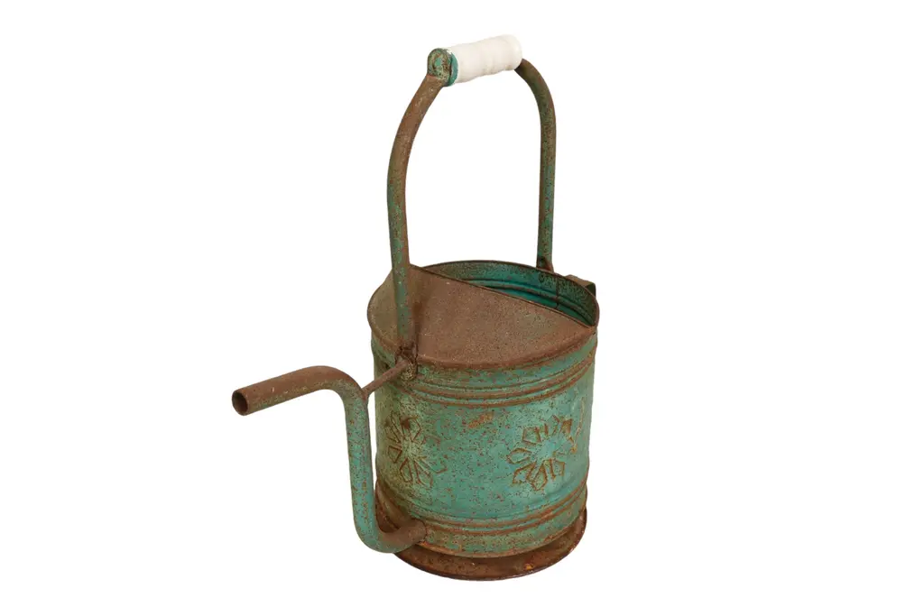 A rustic verdigris watering can. A simple flower design is hammered into each side. The top handle is fitted with a white ceramic hand hold, in front is a simple spout connected at the bottom of the can, and in the back is a ���D�������� shaped handle to assist with pouring.