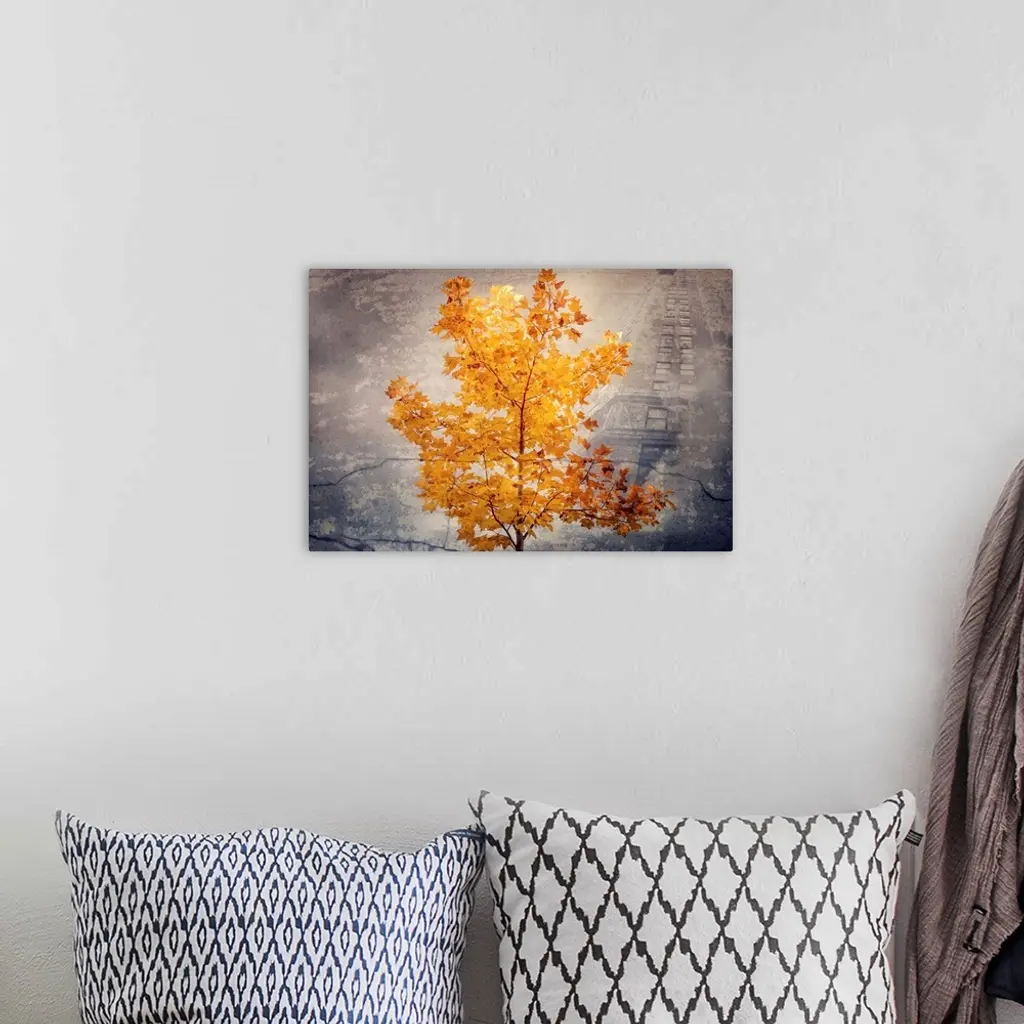 Photographic composite with a beautifully lit Fall tree in the foreground and a tall building in the background with a concrete overlay creating texture.