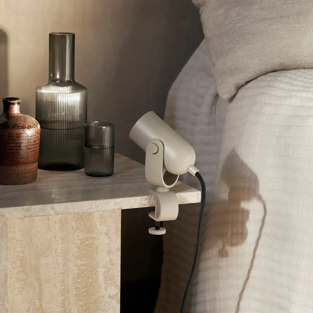 Inspired by industrial architecture and engineering, the practical and durable Ruuvi Lamp has a clean yet soft expression. Featuring practical thumb grip screws that have also inspired its name, the shade of the Ruuvi Lamp can be adjusted to provide light in any direction, while the clamp system allows the lamp itself to be attached to any surface in the home. Use the functional lamp to light up your beloved shelving system, for illuminating the pages of your favorite book while reading in bed, as a bright light when preparing delicious meals in the kitchen or in any other space where you need a practical light source that can easily be moved and adjusted.