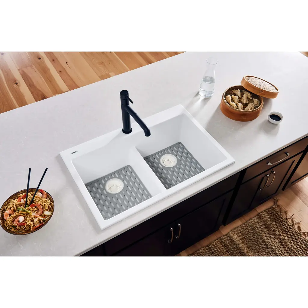 This Patent Pending two-piece silcone bottom grid is the perfect companion to your epiGranite kitchen sink. Designed for use with Ruvati RVG1033 and RVG2033 granite composite kitchen sinks. Not compatible with any other sink or sink brand. The two-piece construction utilizes an innovative tongue and groove design that snaps together. When you want to store the grid, or put it in your dishwasher, you can easily separate the two pieces.
