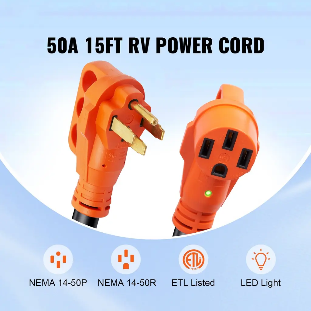 Reliable ETL Certification: Get your RV on the road! RV extension cord is composed of 100% copper wire, which has strong conductivity and outstanding thermal resistance. The outer layer is wrapped in PVC, which is insulated, water-proof, high temperature-resistant, and wear-proof. The RV extension cord will not degrade over time and will not be damaged even if used outdoors for a long time. Comfortable to Grip: Are you tired of tangles and knots? Well, let's get things straightened out! The handle design makes the RV power cord easy to unplug/plug effortlessly. Additionally, it comfortable fit right in your hand! It reduces the risk of plug and wire damage caused by forceful use and enhances durability and security. Store with Ease: Our extension cord for RVs is equipped with an adjustable carry strap and a Velcro design for firmer bonding. When the gauge extension cord is not in use, it can be easily rolled up and stored without taking up space in your RV or home. Roll up with ease and store for future use. It's that easy! Intuitive LED Indicator: You will always know the status of your cord! The female end has the LED indicator light, so the power status is clear at just a glance. The plug adopts an orange color, which is bright and effortless to identify. It can be easily found at night, reducing the risk of accidental injuries in the dark. Widely Applicable: Our RV cord is 25 feet/50 feet long/ 25 feet/15 feet, with male plug NEMA 14-50P and female plug NEMA 14-50R/(NEMA TT-30R). It comes with a 15A/30A/ 50A adapter, providing a more convenient long-distance power supply for high-power electrical equipment such as RVs. With a length, you can rely on and quality you can trust, you can't go wrong with ! Package Content 1 x RV Extension Cable 1 x Velcro Handle Strap 1 x Warning Label 1 x Protective Case 1 x 15A to 50A Adapter 1 x 15A to 30A Adapter(for 25feet option )