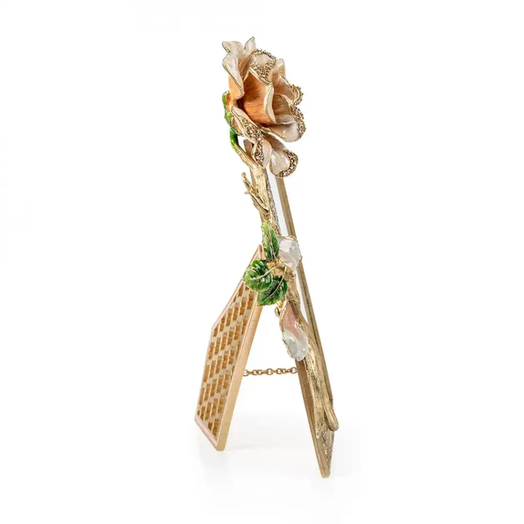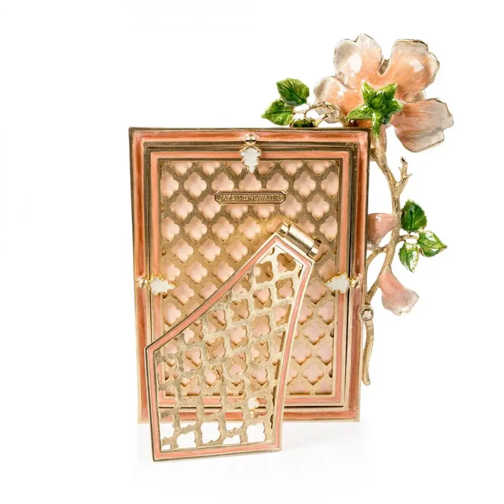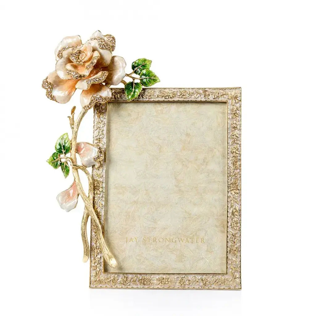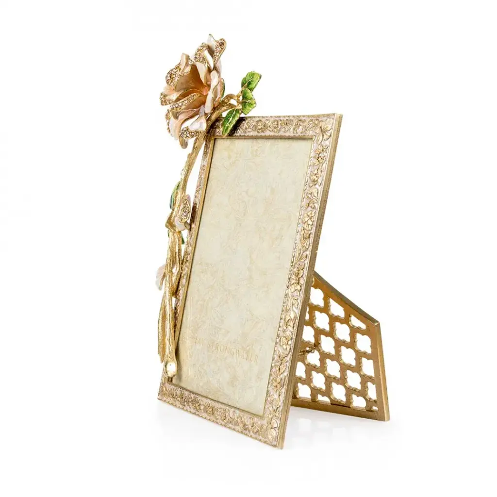 Evoke romance and classic glamour with this gilded frame accented by a dramatic single blush pink rose. Casted in soft pink enamel, plated in 14k gold with 120 sparkling European crystals, this piece is the perfect luxe backdrop for your most-beloved photographs.