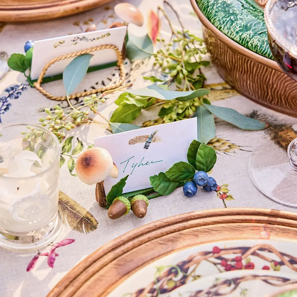 These utterly enchanting place card holders feel as if a magical woodland has sprung to life at every table setting. Featuring acorns, mushrooms, blueberries, and leaves that have been handcrafted and hand-painted in exquisite detail, these are a must-have for all of your autumn table settings.