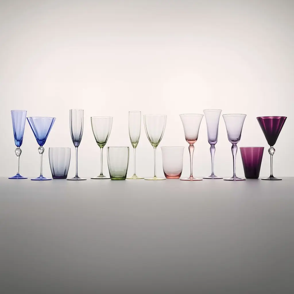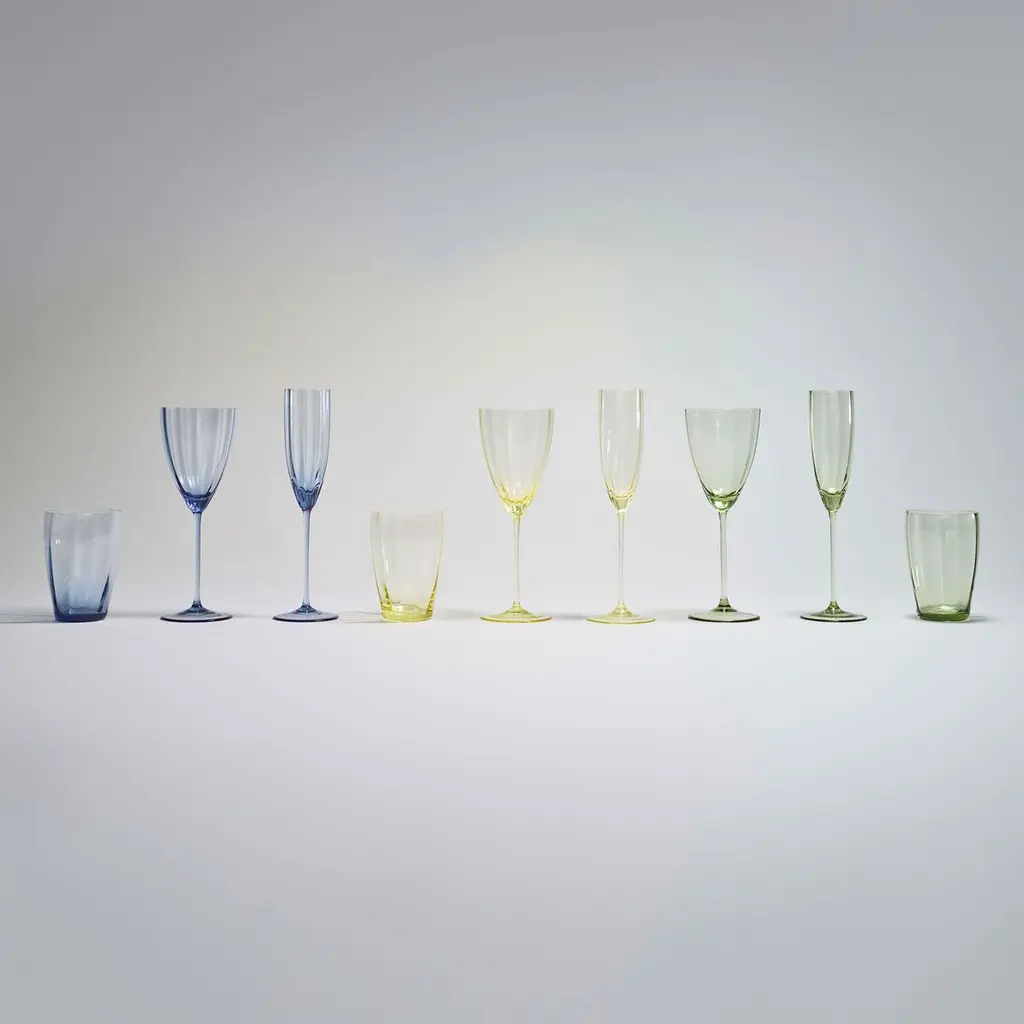 The hand-crafted, mouth-blown Luna Champagne Flute brings a modern elegance to any table. The glass features optic details on the surface of the bowl that catch and reflect light at different angles. These unique glasses are made by hand using colored glass in the Czech Republic.
