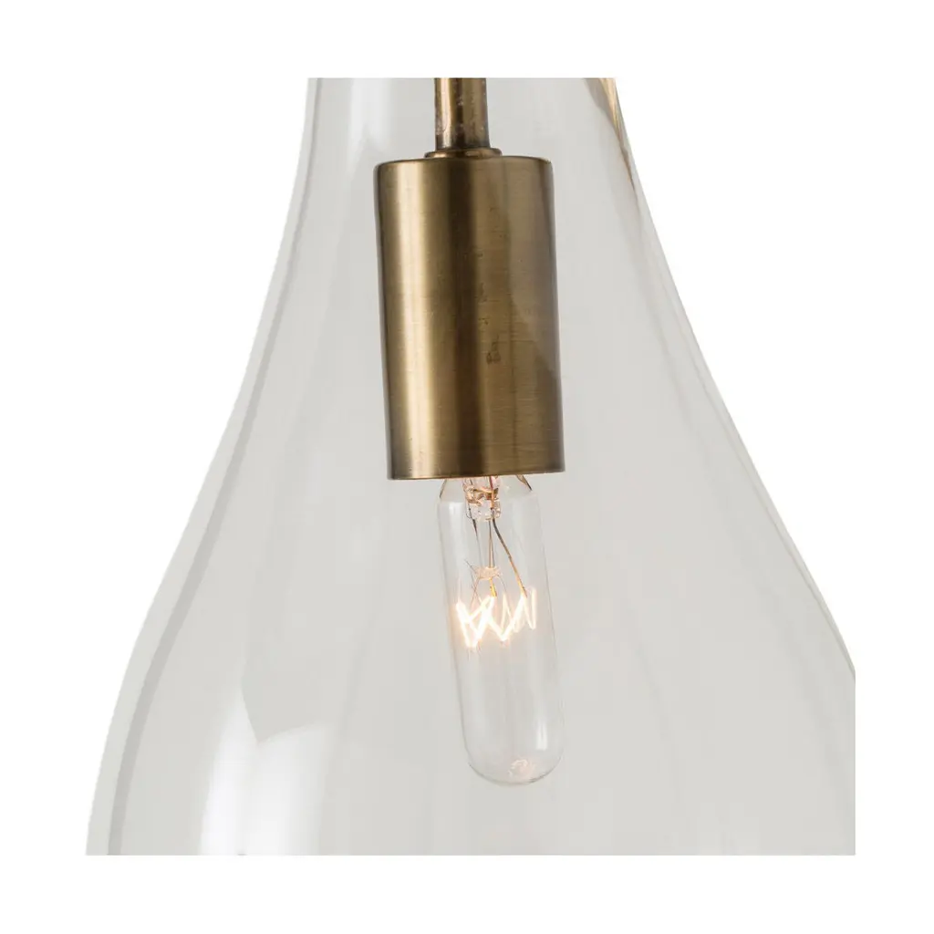 The clear teardrop glass shade houses the bulb of your choice as it is suspended from a square antique brass back plate. Mount multiples down a hallway to create drama. Coordinates with similar table lamp (49889) and floor lamp (79889). Shown with small clear tubular bulb. Approved for use in covered outdoor areas.