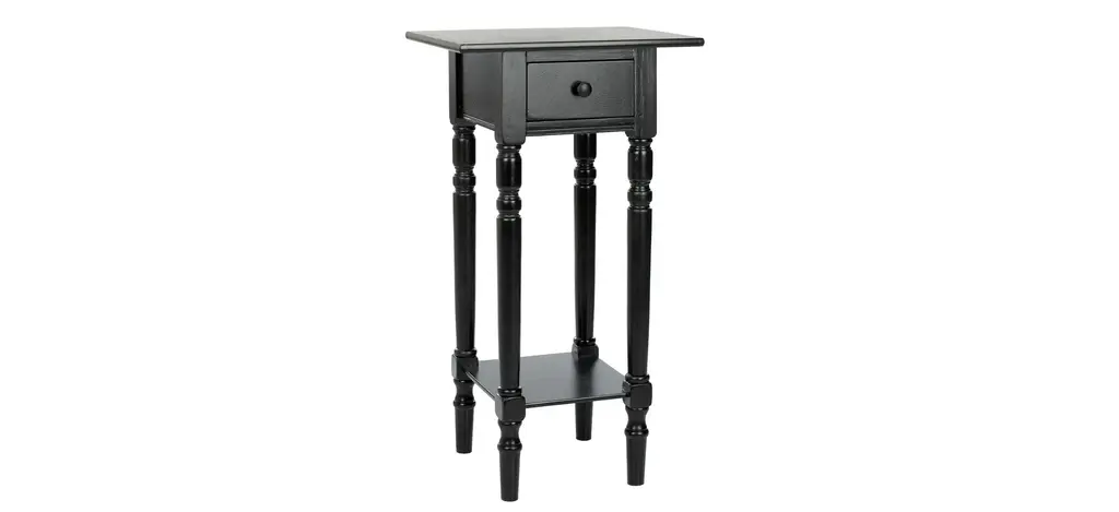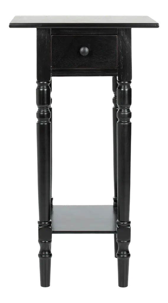 The dainty Sabrina end table with its long, shapely legs marries an easy farmhouse allure with just-right bedside manners. Large enough to hold essentials, like glasses, reading lamp and books, Sabrina, in pine with distressed black finish, doesn't need much space to shine.