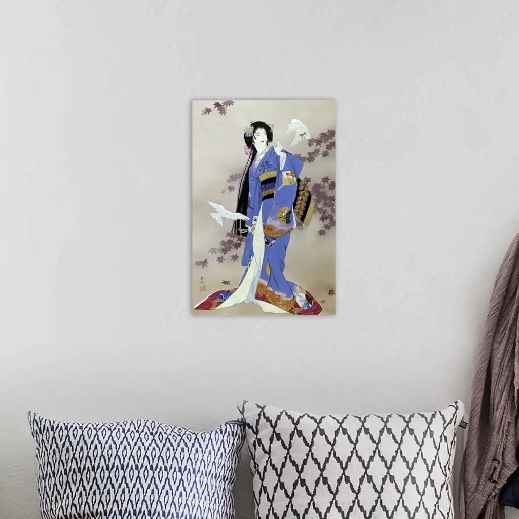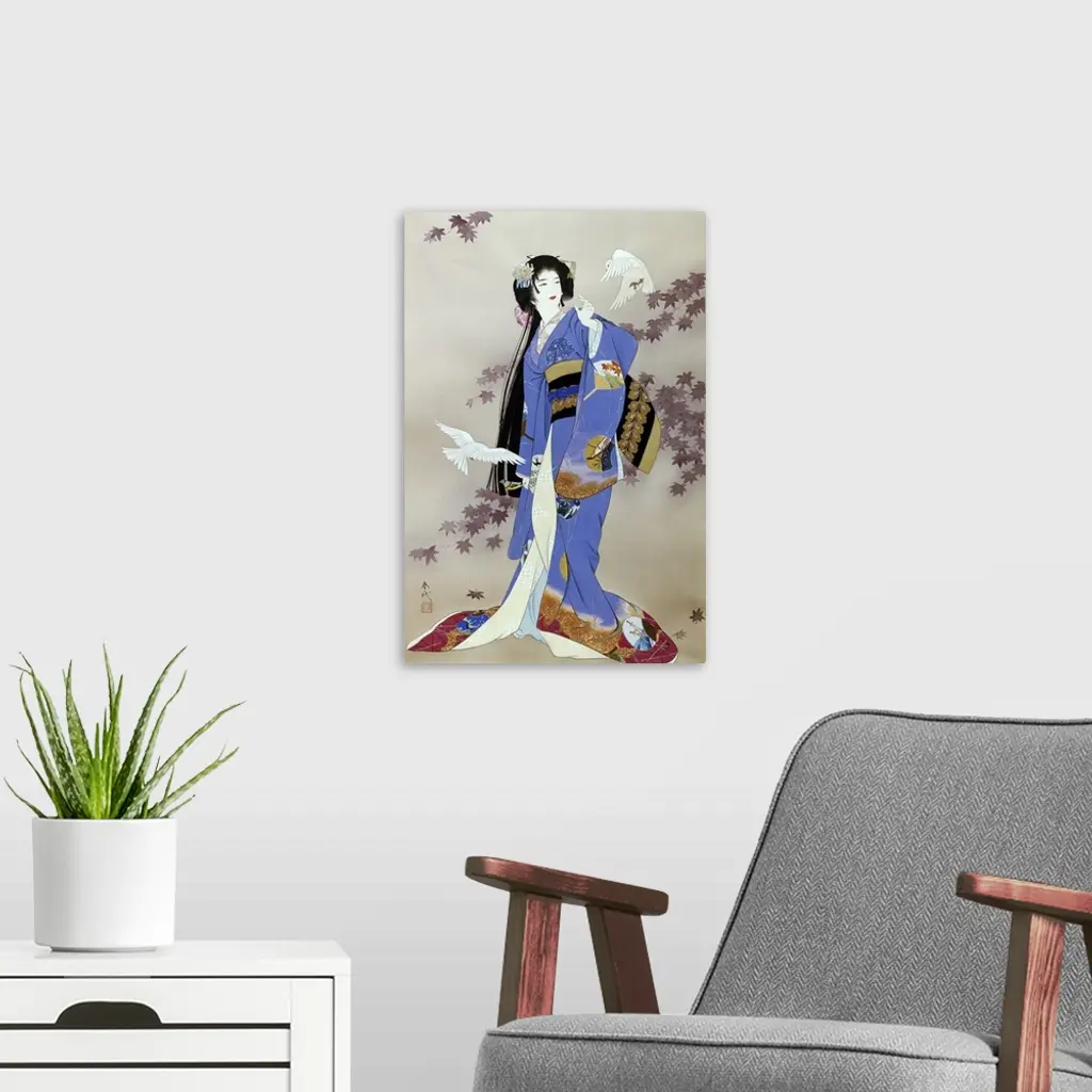 Contemporary colorful Asian art of a Geisha in beautiful ornate clothing.