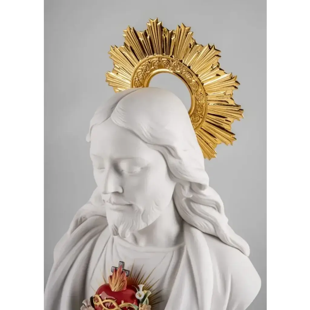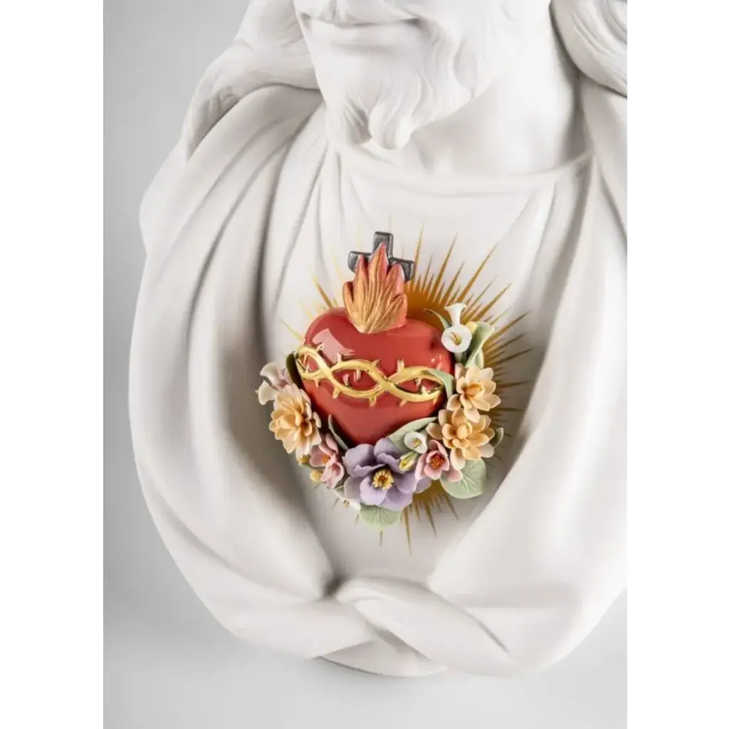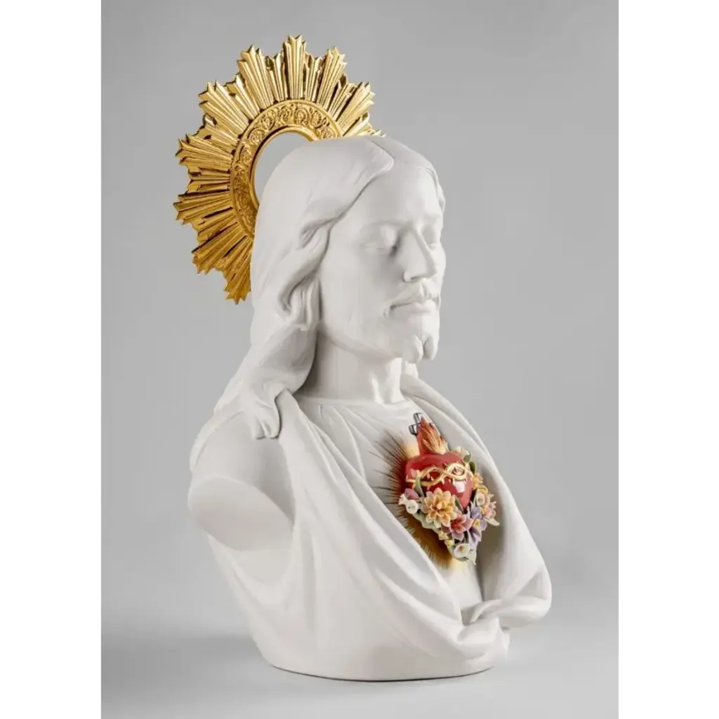 A depiction of the Sacred Heart of Jesus made in white porcelain with golden luster and sumptuous floral decoration. An iconic Spanish brand, Lladro is a world leader in the creation of porcelain art. Started by brothers Juan, Jose and Vicente Lladro in 1953, the ceramic figurines were initially inspired by the works of great European manufacturers like Meissen and Sevres. Over time, a unique style was forged, consisting of elongated lines, a revolutionary single-firing method, and soft pastel tones.