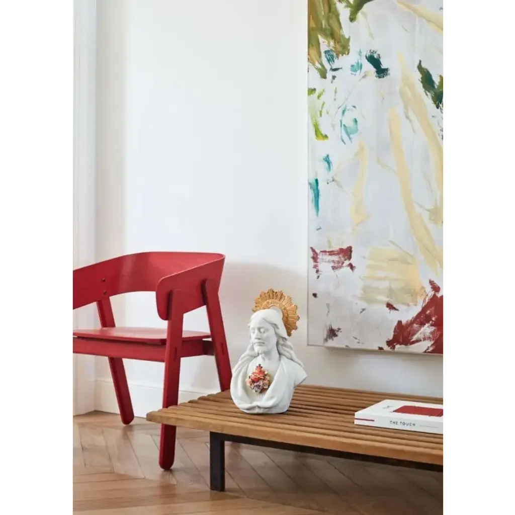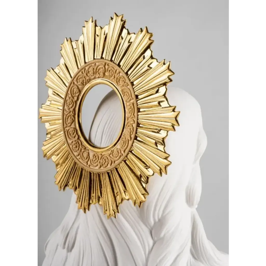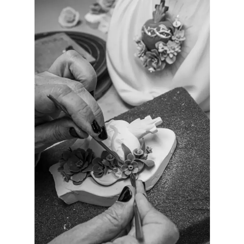 A depiction of the Sacred Heart of Jesus made in white porcelain with golden luster and sumptuous floral decoration. An iconic Spanish brand, Lladro is a world leader in the creation of porcelain art. Started by brothers Juan, Jose and Vicente Lladro in 1953, the ceramic figurines were initially inspired by the works of great European manufacturers like Meissen and Sevres. Over time, a unique style was forged, consisting of elongated lines, a revolutionary single-firing method, and soft pastel tones.