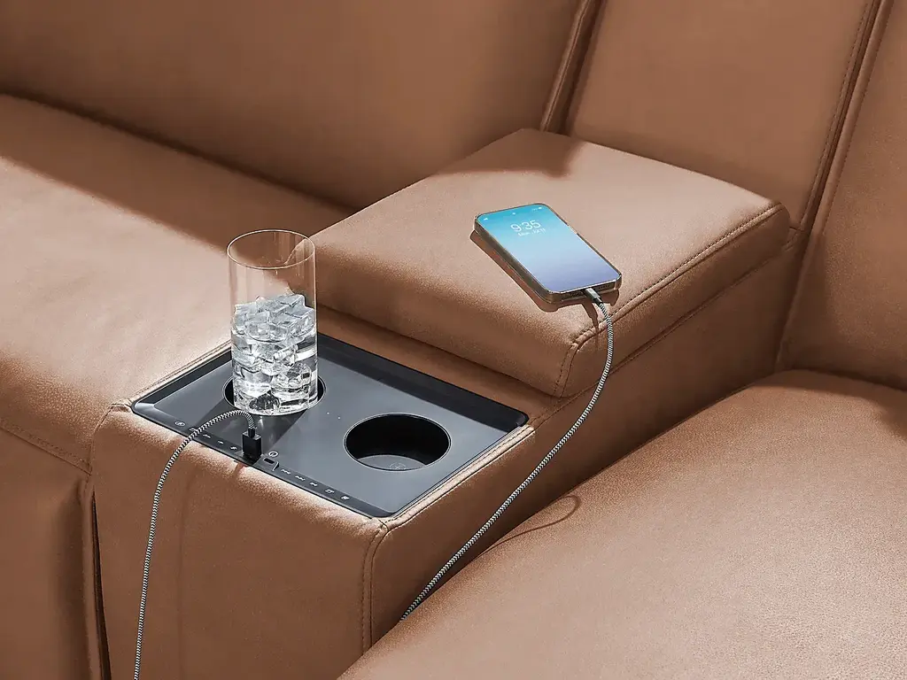 Discover the unlimited possibilities of the dual power reclining ModularTwo, thoughtfully designed with both comfort and flexibility in mind. Contemporary in style and upholstered in a plush suede-soft microfiber, its tailored silhouette is enhanced by welted track arms and tufted back cushions for a look of refined elegance and serenity. Each piece is upholstered on all sides, offering endless opportunities for both reconfiguration as well as individual use. Dual power reclining functionality allows for easy adjustment in the headrest and footrest, providing the ultimate in personalized comfort. The console includes a bluetooth-enabled sound system, retracting cupholders, wireless charging and a compartment with hidden storage for easy access to your lounging essentials. Select a preconfigured design or visit a showroom to learn about individual components and create the modular solution perfect for your space and style. Upholstery: 100% Polyester