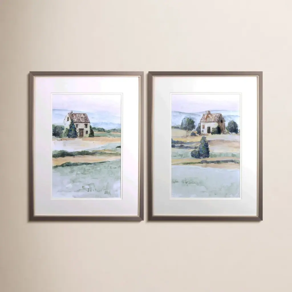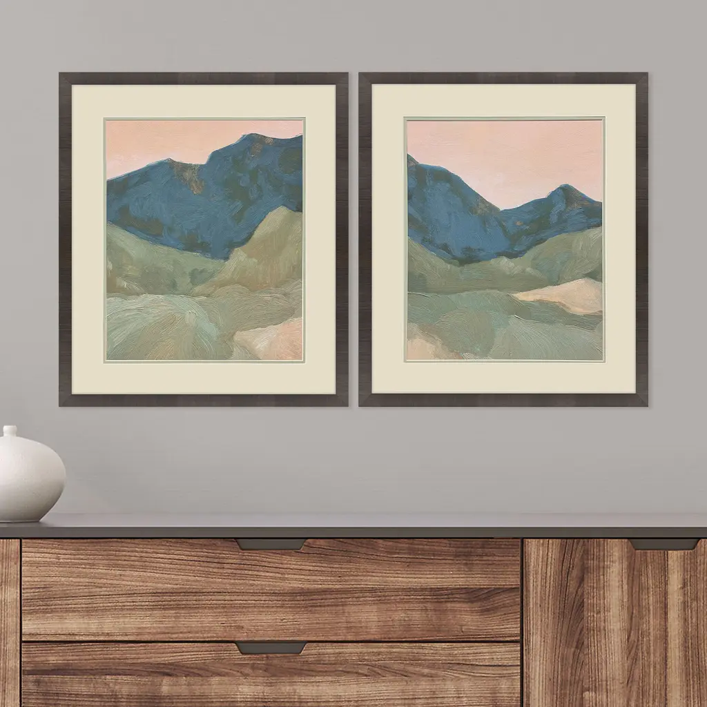A set of majestic mountain prints in blue are double matted in putty and pale laurel. Framed in a dark espresso wood finish molding.