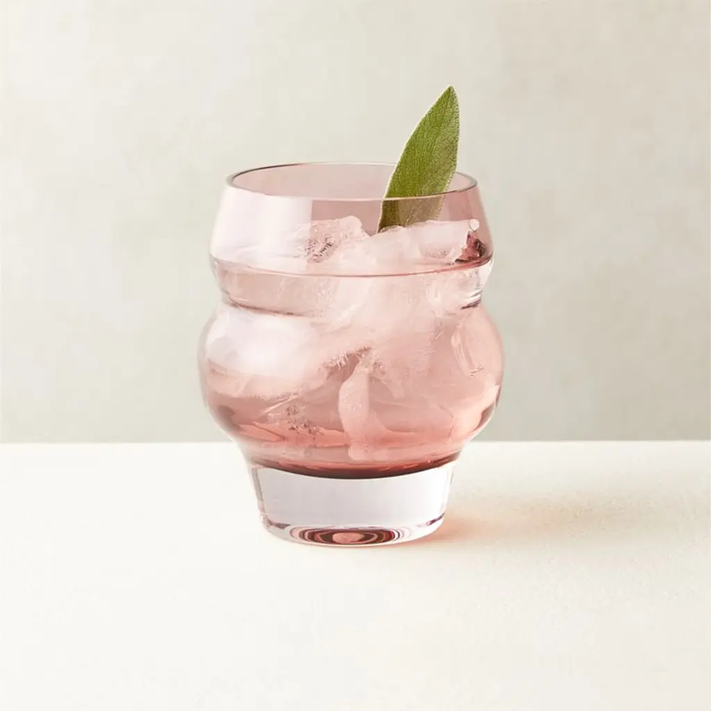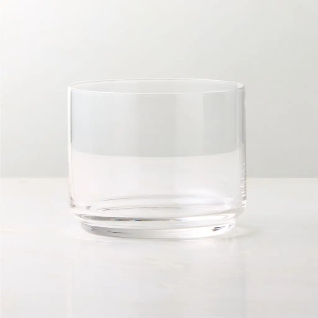 Stackable double old-fashioned glass is handblown by skilled artisans from fine crystalline glass. The sleek silhouette takes shape with a round sham, straight sides and a cold-cut rim for a uniform edge. Complete the collection with our Sadie cooler glass. CB2 exclusive.