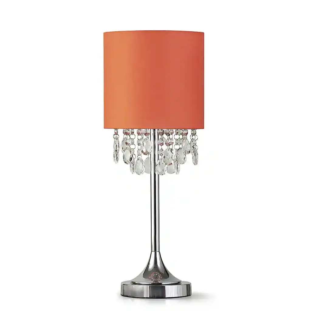 Inspired by an Irish crystal candlestick design, the Derry stacked crystal orb table lamp bridges traditional and transitional decorating styles with ease. An arrangement of alternating faceted cut crystal balls and spheres distinguishes this romantic set of two lamps, each topped with a chic orange geneva shade.Features:Setting: IndoorFixture finish: CrystalIncludes: Two (2) lampsShades: Lighting has a orange geneva shadeSocket switchNumber of lights: 1Requires one (1) 40-watt bulb (included)Measures 15 inches high x 9 inches wide x 9 inches deepAssembly required.