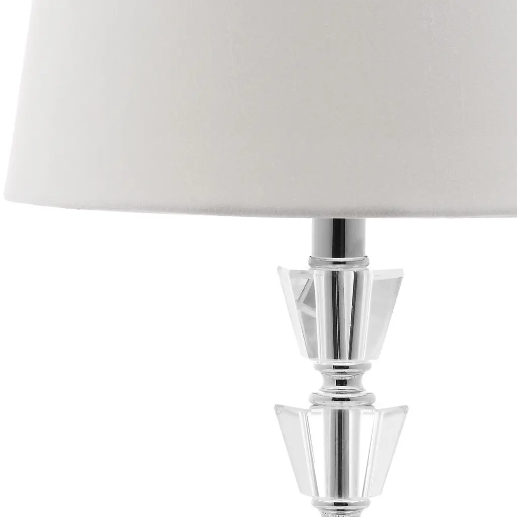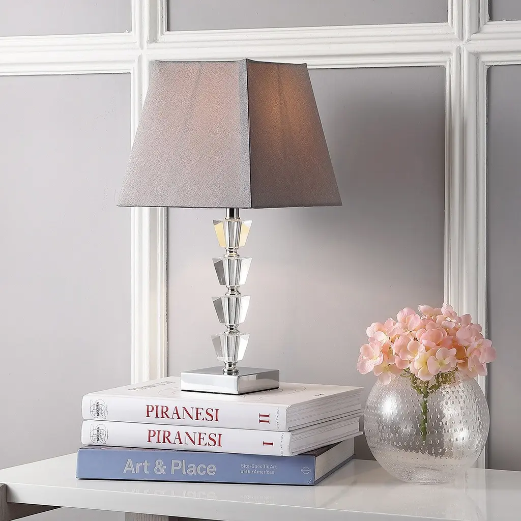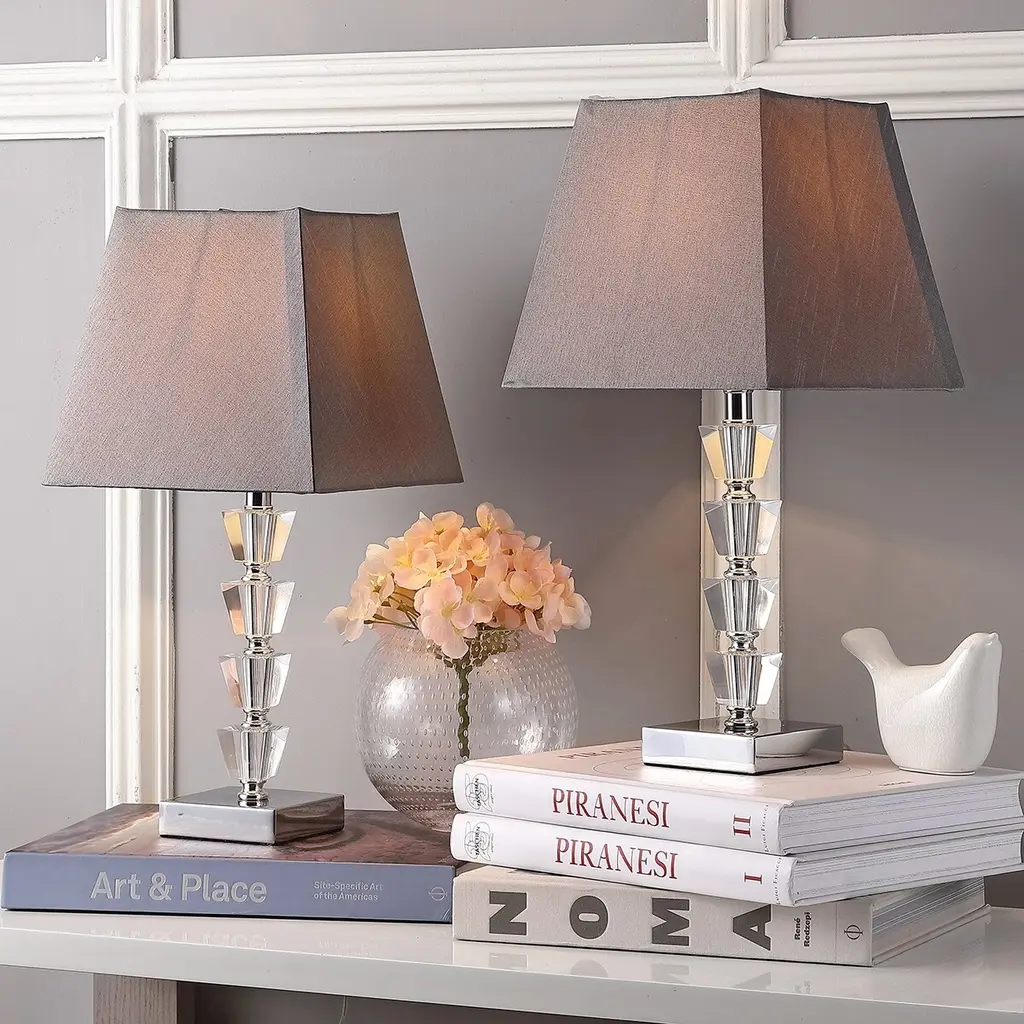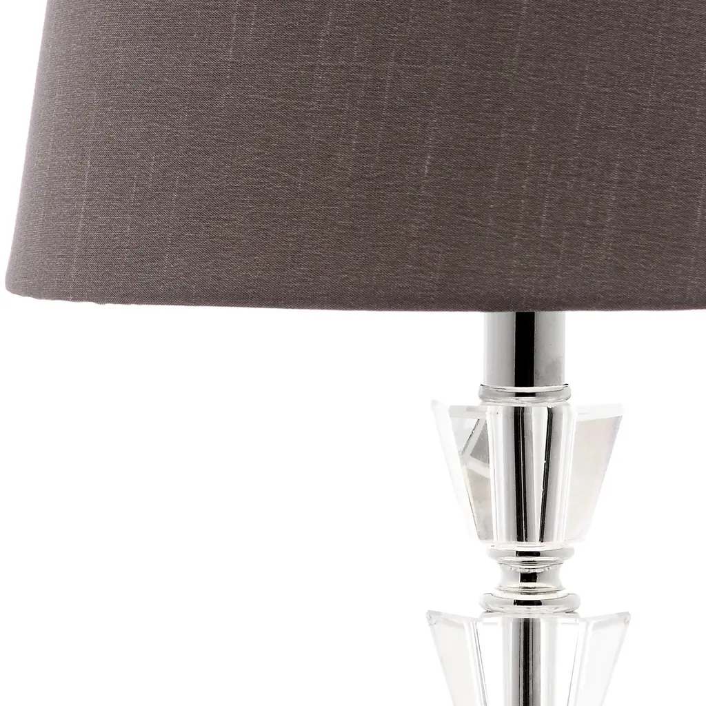 The sleek elegance of art deco style is beautifully captured in this set of two Avalon Deco crystal lamps. Crafted of four solid crystal inverted pyramids and accented with chrome, the striking Avalon design is topped with an angular grey linen hardback shade.Features:Setting: IndoorFixture finish: CrystalIncludes: Two (2) lampsShades: Lighting has a grey geneva shadeSocket switchNumber of lights: 1Requires one (1) 60-watt bulb (included)Measures 17.25 inches high x 9 inches wide x 9 inches deepAssembly required.