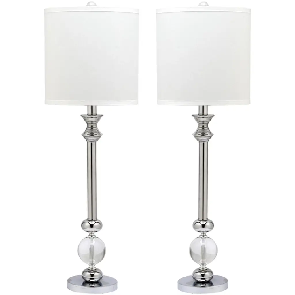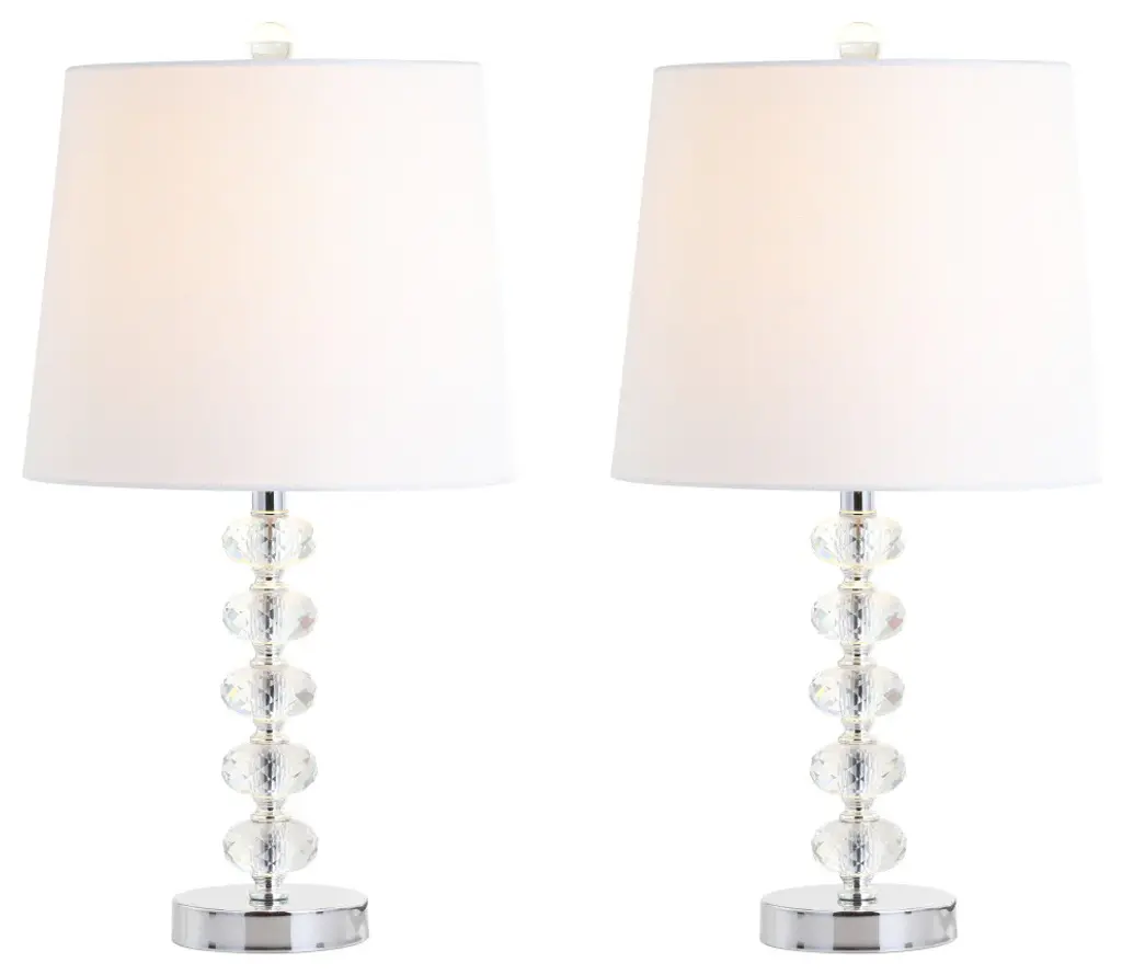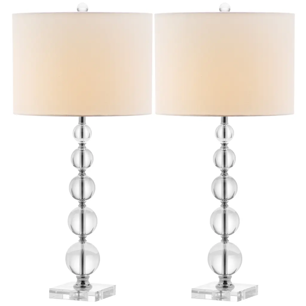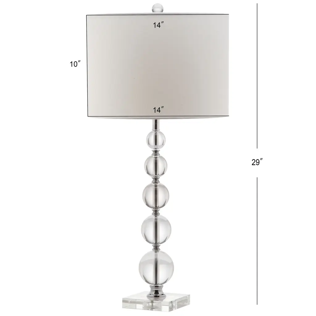 Dress up a hallway console or living room table with this glamorous set of two Liam stacked crystal ball lamps. With white linen drum shade and five graduated clear crystal balls floating on a square see-through stand, this transitional design bridges classic and contemporary interior decorating styles.Features:Setting: IndoorFixture finish: CrystalIncludes: Two (2) lampsShades: Lighting has a white linen shadeSocket switchNumber of lights: 1Requires one (1) 100-watt bulb (included)Measures 29 inches high x 14 inches wide x 14 inches deepAssembly required