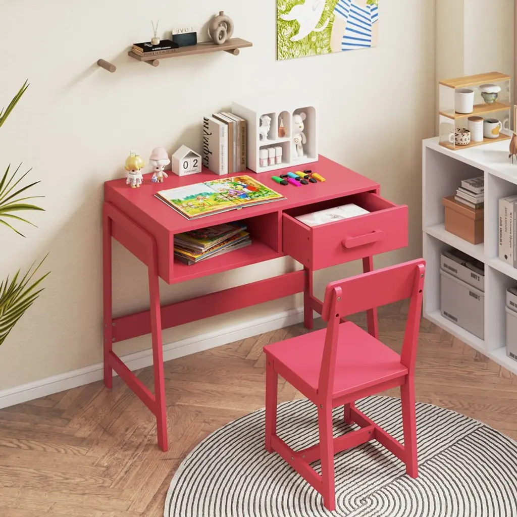This wooden study desk set has ample storage space. The legs of the desk and chair are made of solid pine wood, which is sturdy and durable. Whether it's for writing, reading, drawing or playing, this multi-functional table and chair set can meet your needs. Equipped with a spacious desktop, open compartments and pull-out drawers, it enables you to keep your study essentials such as books and stationery neatly organized. The ergonomic chair is equipped with a high backrest, which helps cultivate healthy sitting habits.Color: Pink Material: MDF + Pine Wood Table Size: 33.5" x 19" x 27.5" (L x W x H) Chair Size: 14" x 13" x 27" (L x W x H) Drawer Inner Size: 17" x 13" x 4"(L x W x H) Tabletop Size: 32" x 19" (L x W) Seat Size: 14" x 13.5" x 14" (L x W x H) Suitable Age: 3+ years old Weight Capacity of Tabletop: 200 lbs Weight Capacity of Chair: 110 lbs Net Weight: 42.5 lbs Package Includes: 1 x Study Table 1 x Chair 1 x User Guide