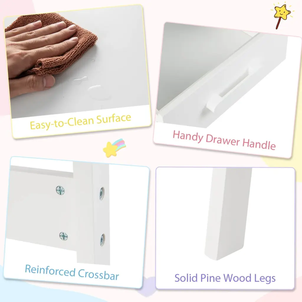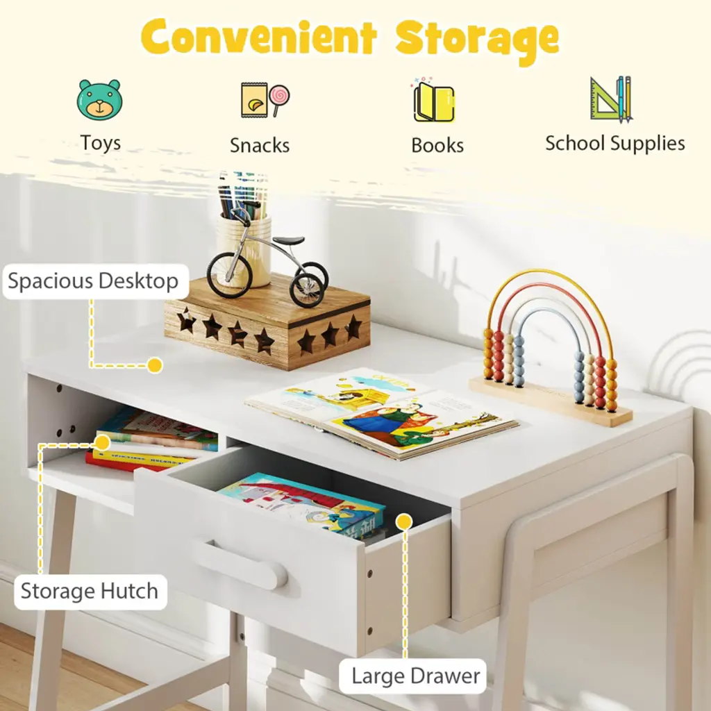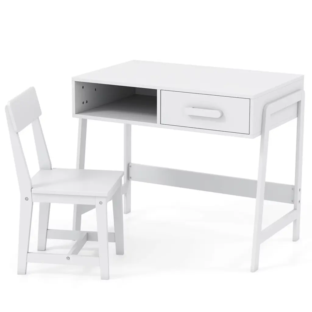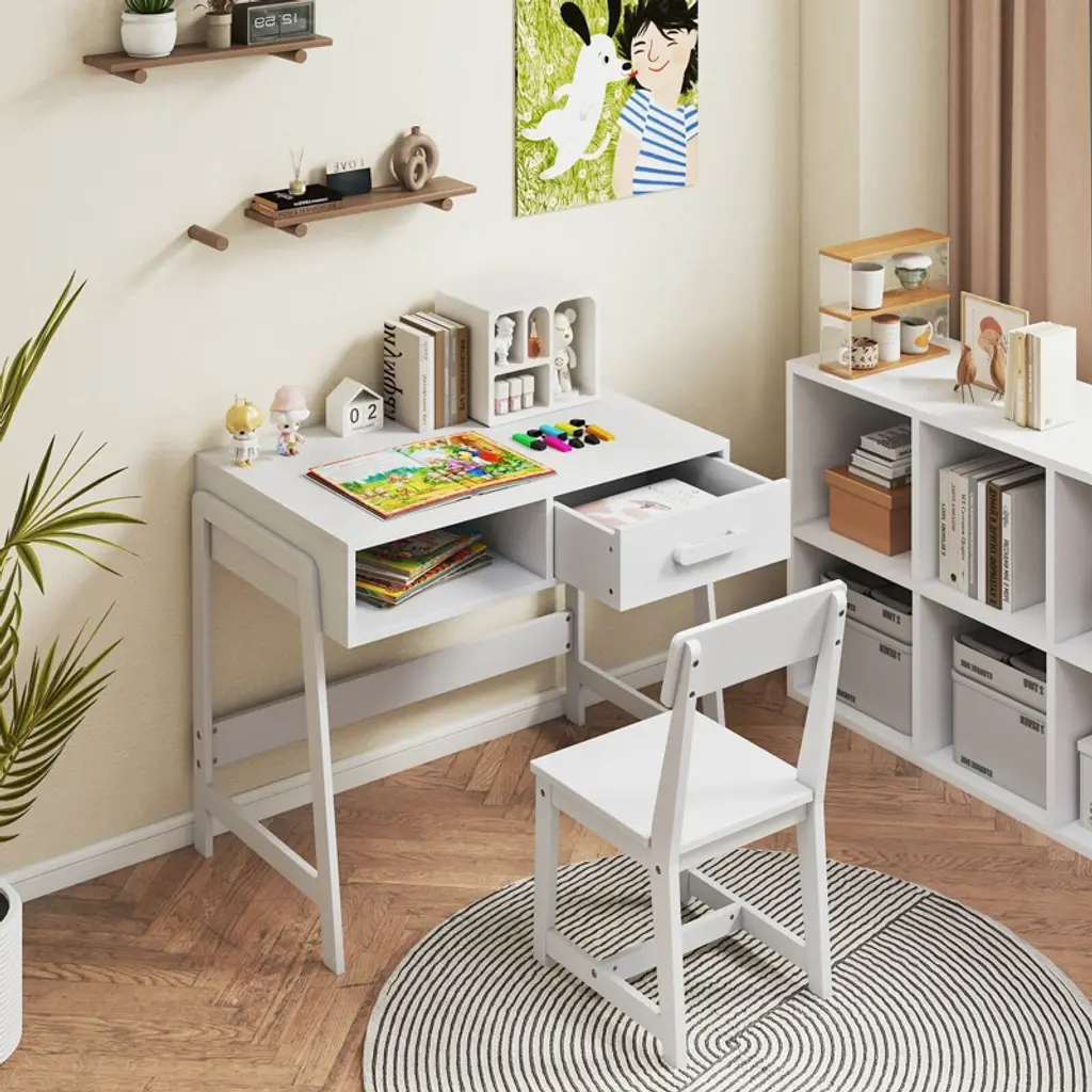 This wooden study desk set has ample storage space. The legs of the desk and chair are made of solid pine wood, which is sturdy and durable. Whether it's for writing, reading, drawing or playing, this multi-functional table and chair set can meet your needs. Equipped with a spacious desktop, open compartments and pull-out drawers, it enables you to keep your study essentials such as books and stationery neatly organized. The ergonomic chair is equipped with a high backrest, which helps cultivate healthy sitting habits.Color: White Material: MDF + Pine Wood Table Size: 33.5" x 19" x 27.5" (L x W x H) Chair Size: 14" x 13" x 27" (L x W x H) Drawer Inner Size: 17" x 13" x 4"(L x W x H) Tabletop Size: 32" x 19" (L x W) Seat Size: 14" x 13.5" x 14" (L x W x H) Suitable Age: 3+ years old Weight Capacity of Tabletop: 200 lbs Weight Capacity of Chair: 110 lbs Net Weight: 42.5 lbs Package Includes: 1 x Study Table 1 x Chair 1 x User Guide