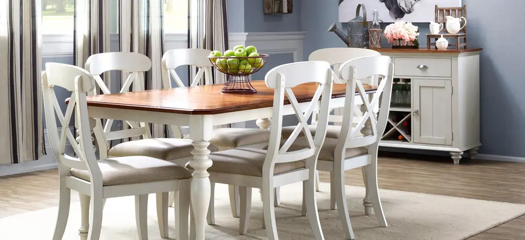 If you love the look of timeworn furniture, you're sure to appreciate this Sagamore dining table with leaf. Its distressed bisque finish, distressed natural pine-finished top and turned legs infuse the table with casual beauty. And when guests come calling, just add the 18" extension leaf for added elbow room.
