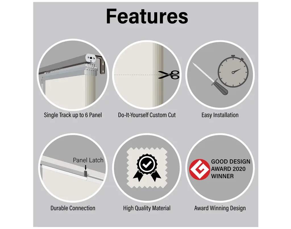 Central Design Products is pleased to introduce a new innovative panel track that offers easy 2-way installation, adding an alluring style and refined touch to your home decor. The single rail design of the track is sleek, compact, and reduces the overall footprint and weight of the installation, eliminating bulky, intrusive window treatments. Adjusting the panel height is a breeze � simply trim the panel, re-attach the liner, and install the panel weight. Detailed instructions are included.The panel track also features a patented slider design, made with aluminum and fitted with bearings that allow for durable and smooth operation. The sliders are stacked closer together than conventional panel tracks, reducing light bleed coming from the gaps between panels. This track has endless uses from dividing rooms, garages, offices, and closets to decorating windows and patios. Available in larger sizes including 8, 10, and 12 panels.Extends from 48-88� wide.Each panel measures 23.5" wide and 91.5" tall, with a total installation height of 94" (includes the 2.5" rail track).The track can be wall or ceiling mounted.The panels can stack on the left or the right.The clearance from the wall is extendable from 1.25� to 3.25� and projection from the wall is extendable from 3� to 4.25�.Sage panel is made from 100% Polyester, with a light filtering shade that blocks 70% of the light.