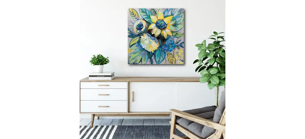 The beautiful, high-quality Sage and Sunflowers I Gallery Wrapped Canvas is sure to be a stunning addition to any decor theme. Mounting hardware included.