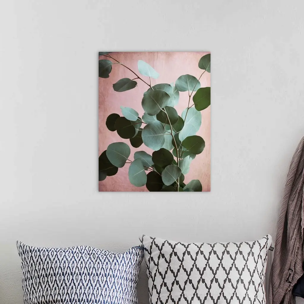 Photography of eucalyptus leaves set against a contrasting pink background.