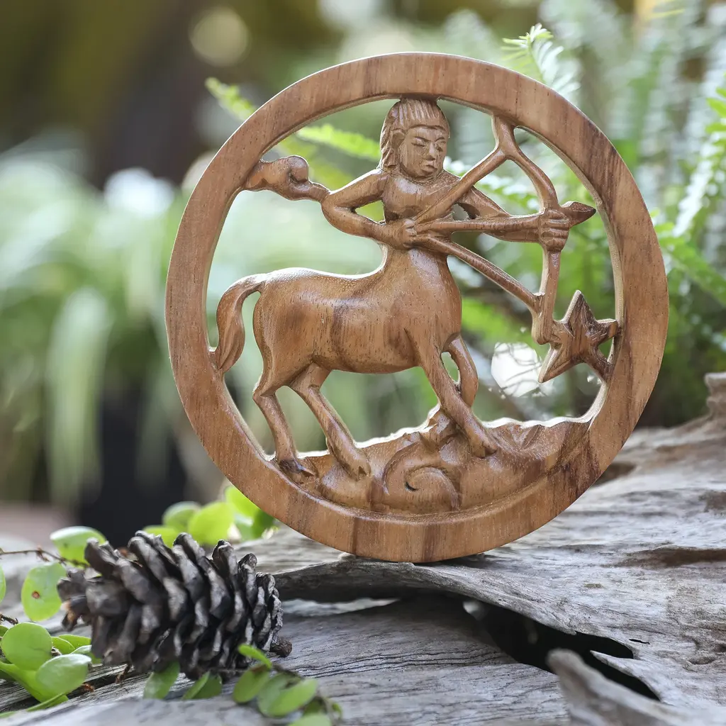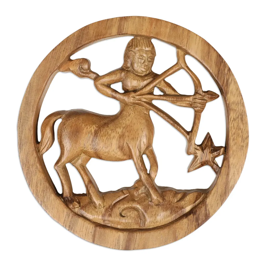 Sagittarius-Themed Hand-Carved Round Suar Wood Relief Panel- Sagittarius Firmament