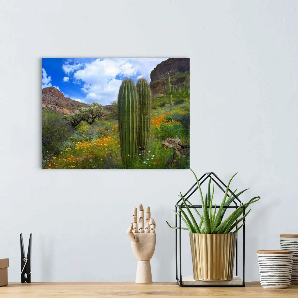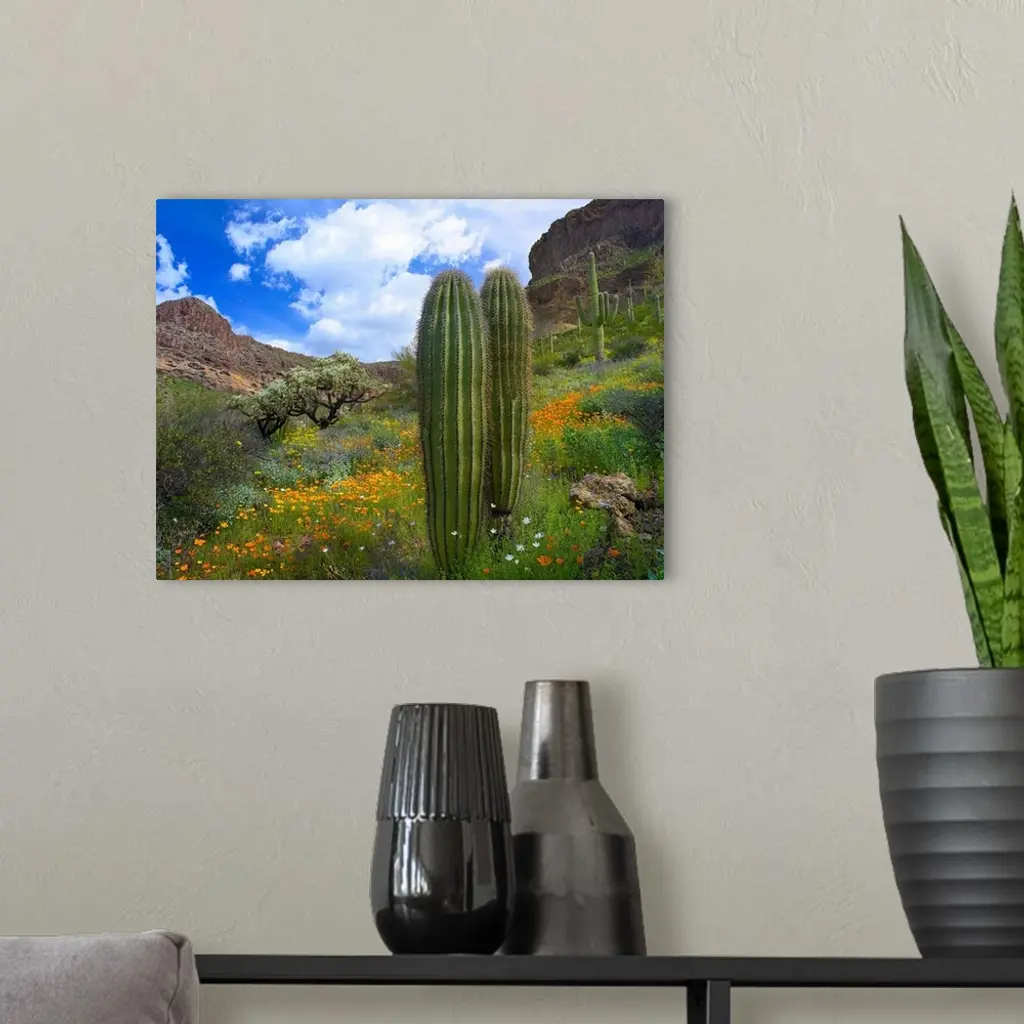 Saguaro amid flowering Lupine, California Brittlebush and Desert Golden Poppies wall art for home and office decor. Discover canvas art prints, photos, mural, big canvas art and framed wall art in GreatBigCanvas.com's varied collections.