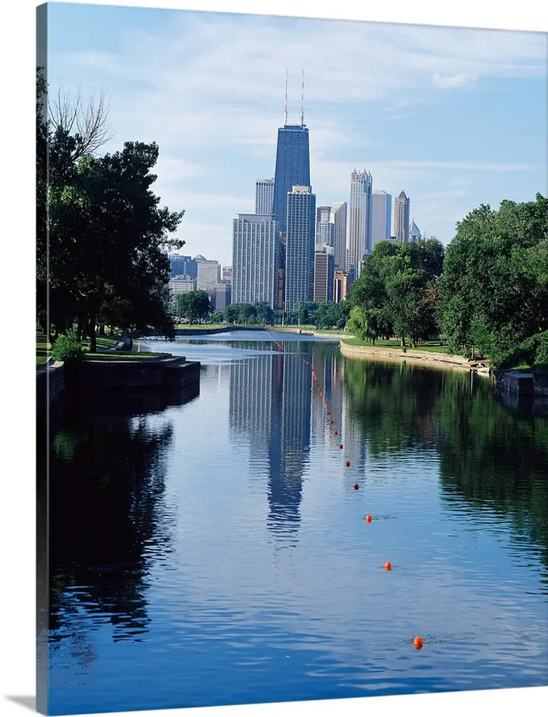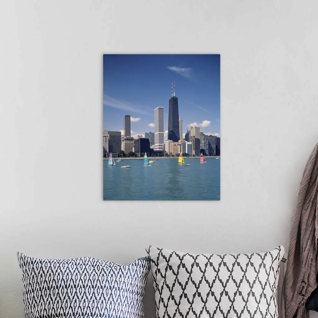 Vertical photograph of several boats on Lake Michigan in front of Chicago skyscrapers in Illinois.
