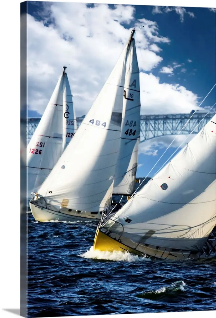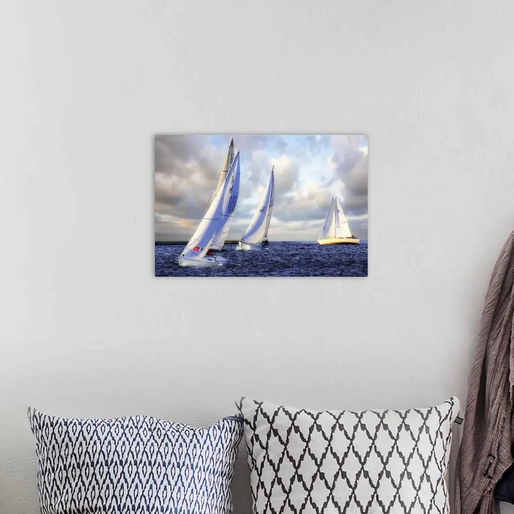 Several sail boats are pictured in open water and the sky filled with grey clouds.