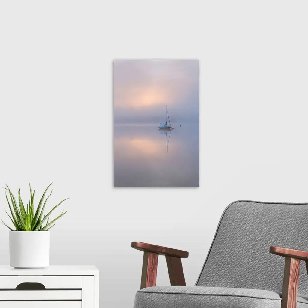 Sailing boat in misty conditions at dawn on a reflective Wimbleball Lake, Exmoor National Park, Somerset, England. Spring (May) 2017.