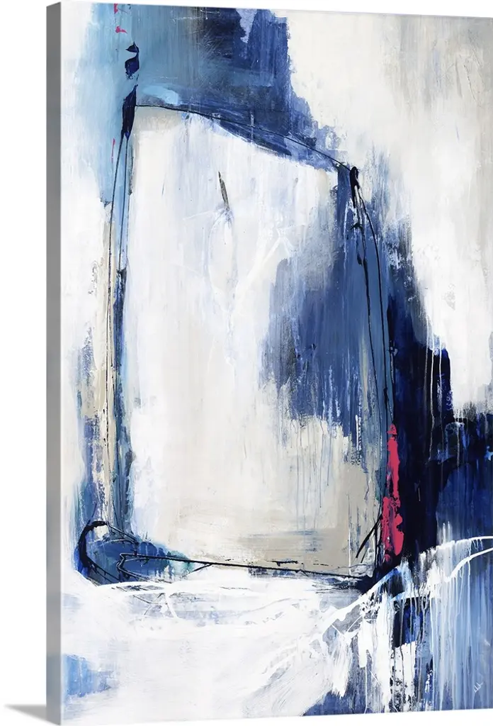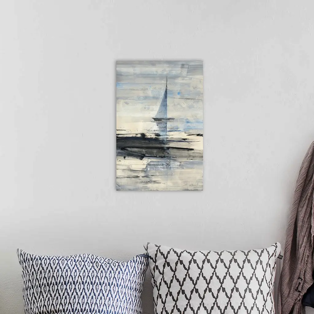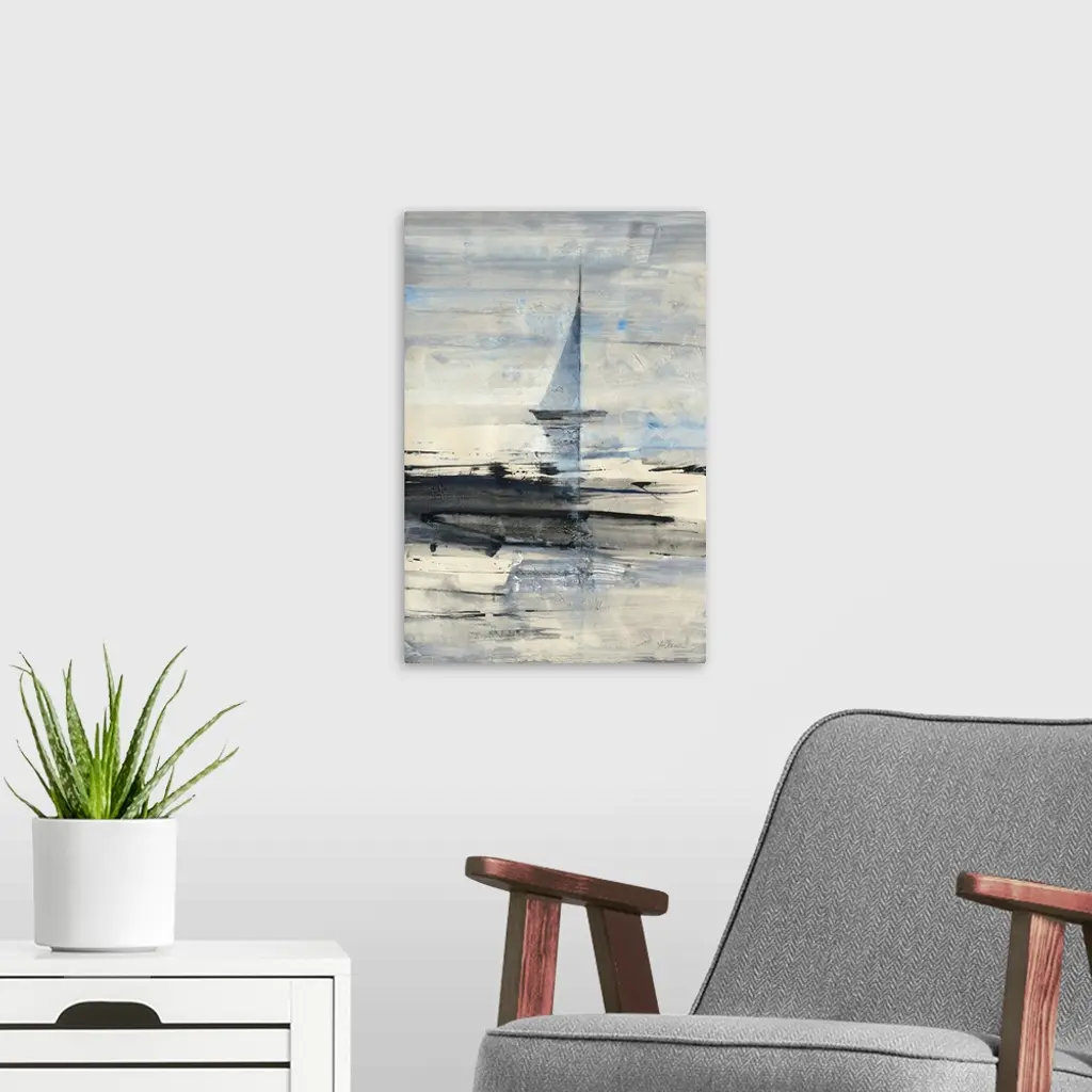 A vertical abstract landscape of a sailboat in the water with black brush strokes overlaying.