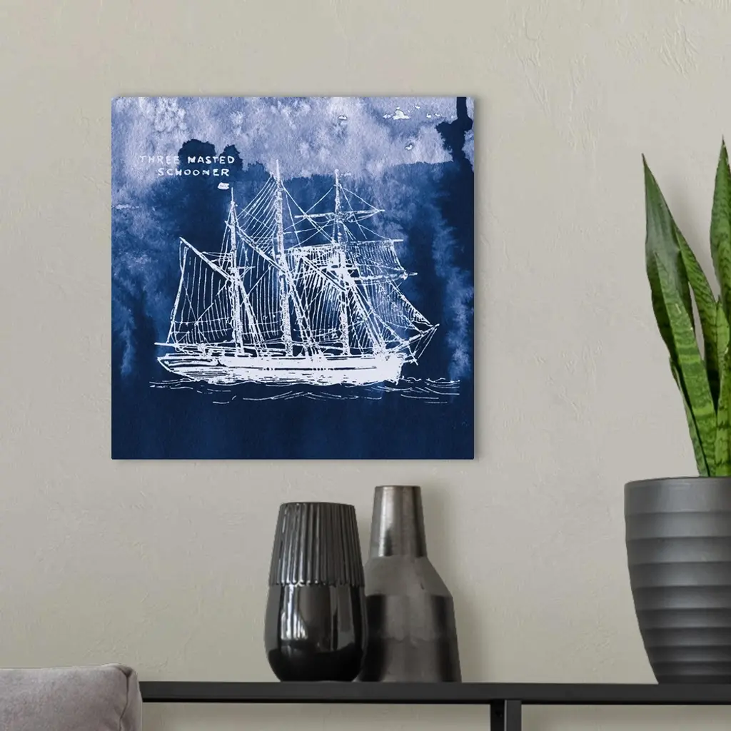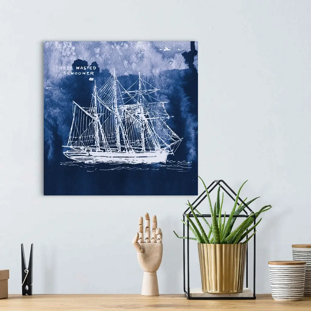 Square art with a white silhouette of a sailboat on an indigo watercolor background and "Three Masted Schooner" written in the corner.