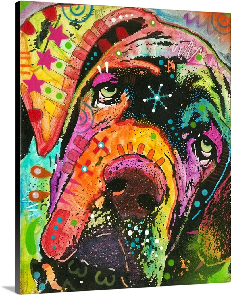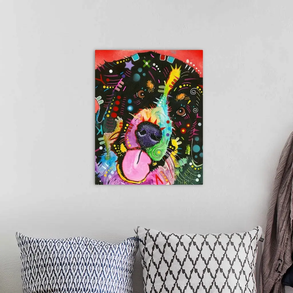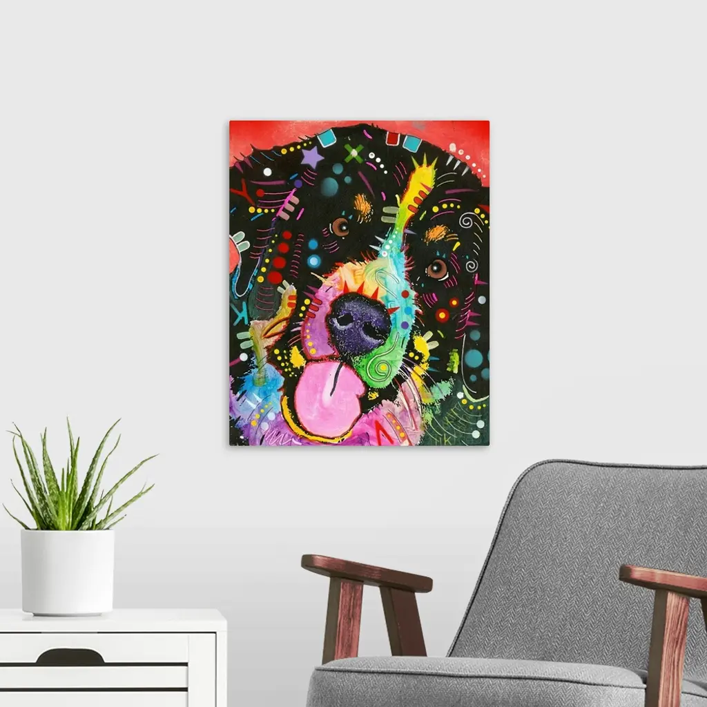 Illustration of a Swiss Mountain Dog with colorful geometric abstract markings on a red background.