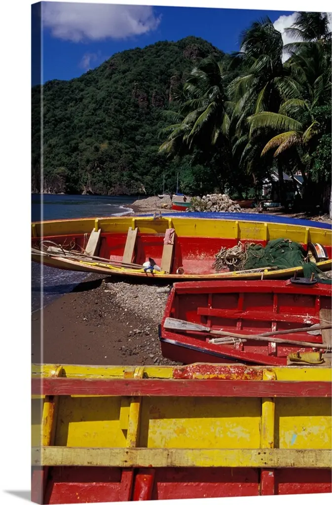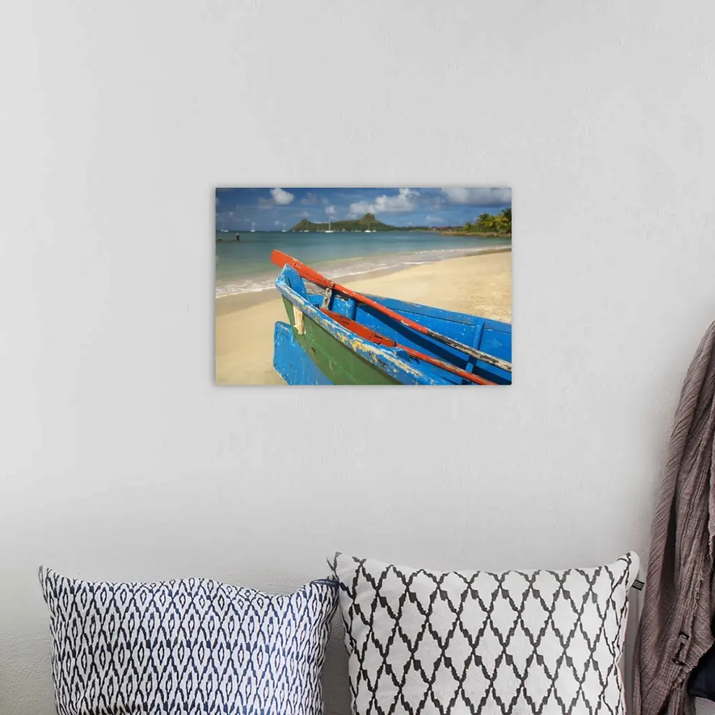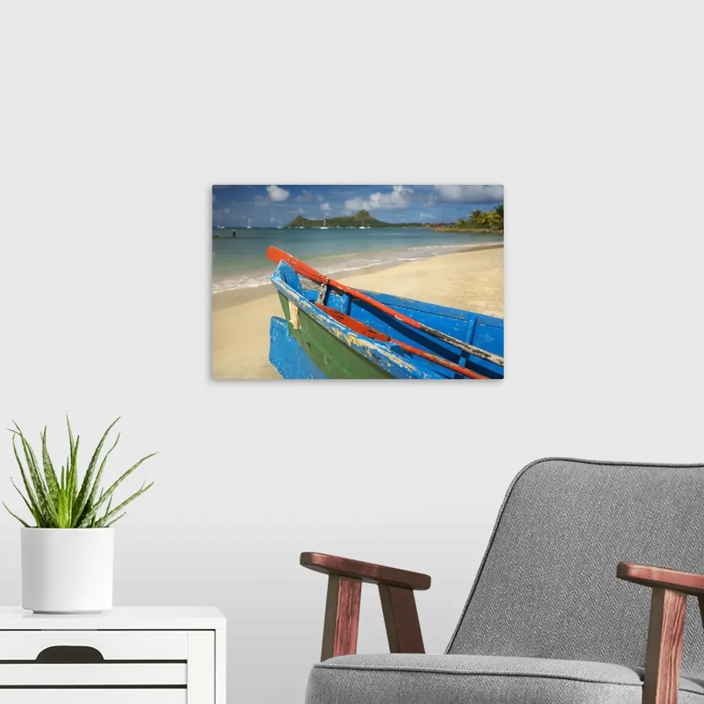 Saint Lucia, Caribbean, Boat on the beach, Pigeon Island in background wall art for home and office decor. Discover canvas art prints, photos, mural, big canvas art and framed wall art in GreatBigCanvas.com's varied collections.